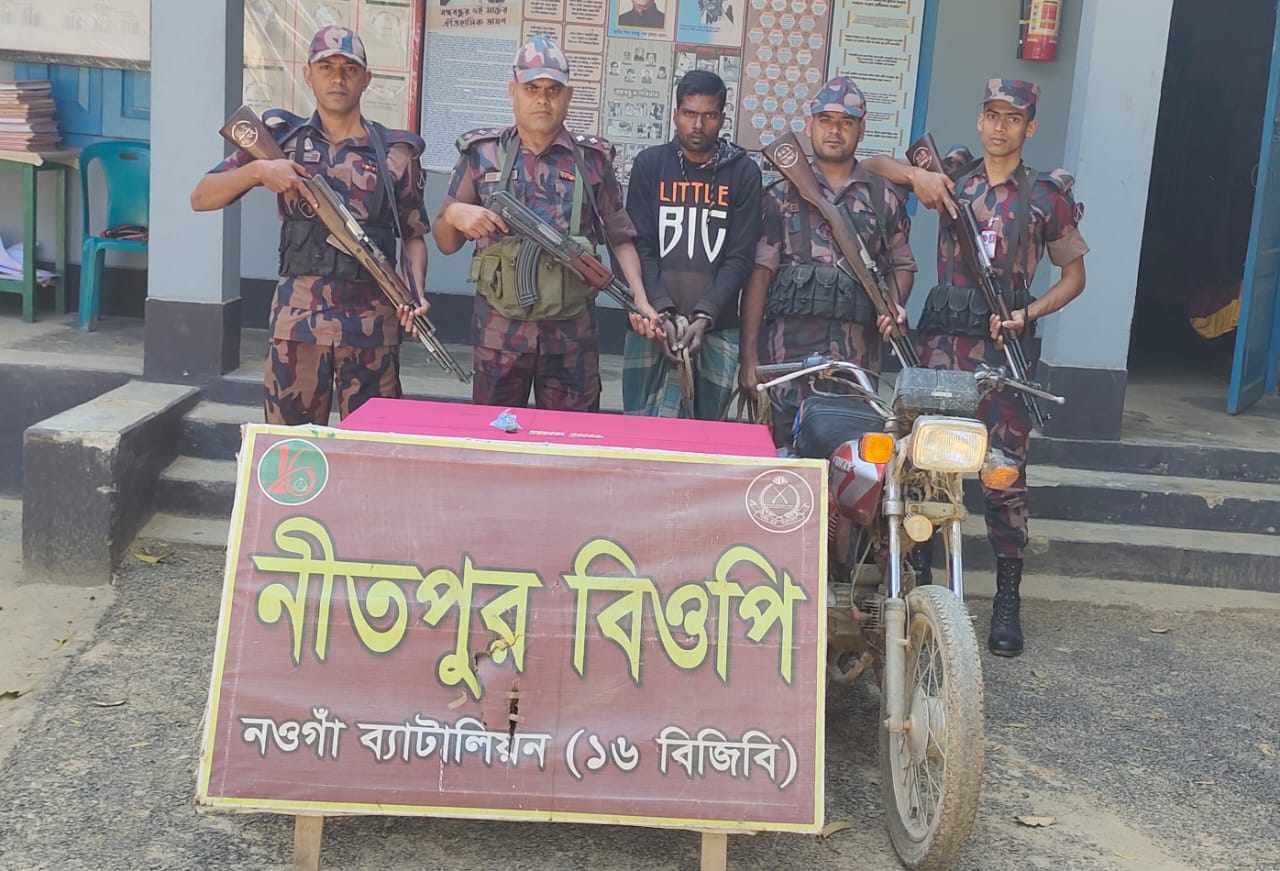 মঙ্গলবার সিভিল সোর্স ও আরআইবি সিপাহী আতিক হাসান এর তথ্যের ভিত্তিতে সংশ্লিষ্ট ব্যাটালিয়নের অধীনস্থ নিতপুর বিওপির টহল কমান্ডার হাবিলদার রকিব খান এর নেতৃত্বে একটি টহল দল বিওপি হতে আনুমানিক ৫ কিঃমিঃ উত্তর পূর্ব দিকে এবং সীমান্ত মেইন পিলার ২৩১ হতে ০৩ কিঃমিঃ বাংলাদেশের অভ্যন্তরে কালাইবাড়ী মোড় পাকা রাস্তার তাকে আটক করা হয়। এসময় তার কাছ থেকে ২০পিস ট্যাপেন্টাডল ট্যাবলেট, ১ পুরিয়া গাঁজা ও পুরাতন রেজিঃ বিহীন লাল রংয়ের ৮০ সিসি একটি মোটর সাইকেল জব্দ করা হয়।