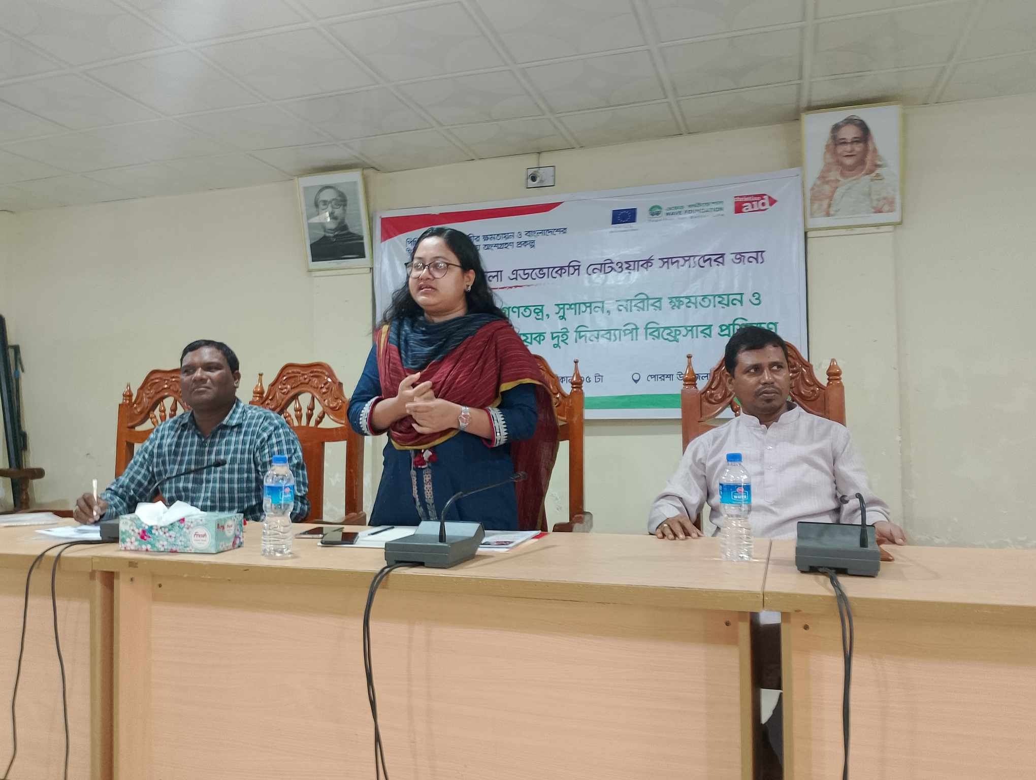 পোরশায় ওয়েব ফাউন্ডেশনের আয়োজনে পিছিয়ে পড়া জনগোষ্ঠীদের রিফ্রেশাস প্রশিক্ষণ কর্মশালা অনুষ্ঠিত হয় উপজেলা পরিষদের হলরুমে। কর্মশালার সমাপনী দিনে প্রধান অতিথি হিসেবে দিকনির্দেশনা মূলক বক্তব্য রাখছেন উপজেলা নির্বাহী কর্মকর্তা সালমা আক্তার।