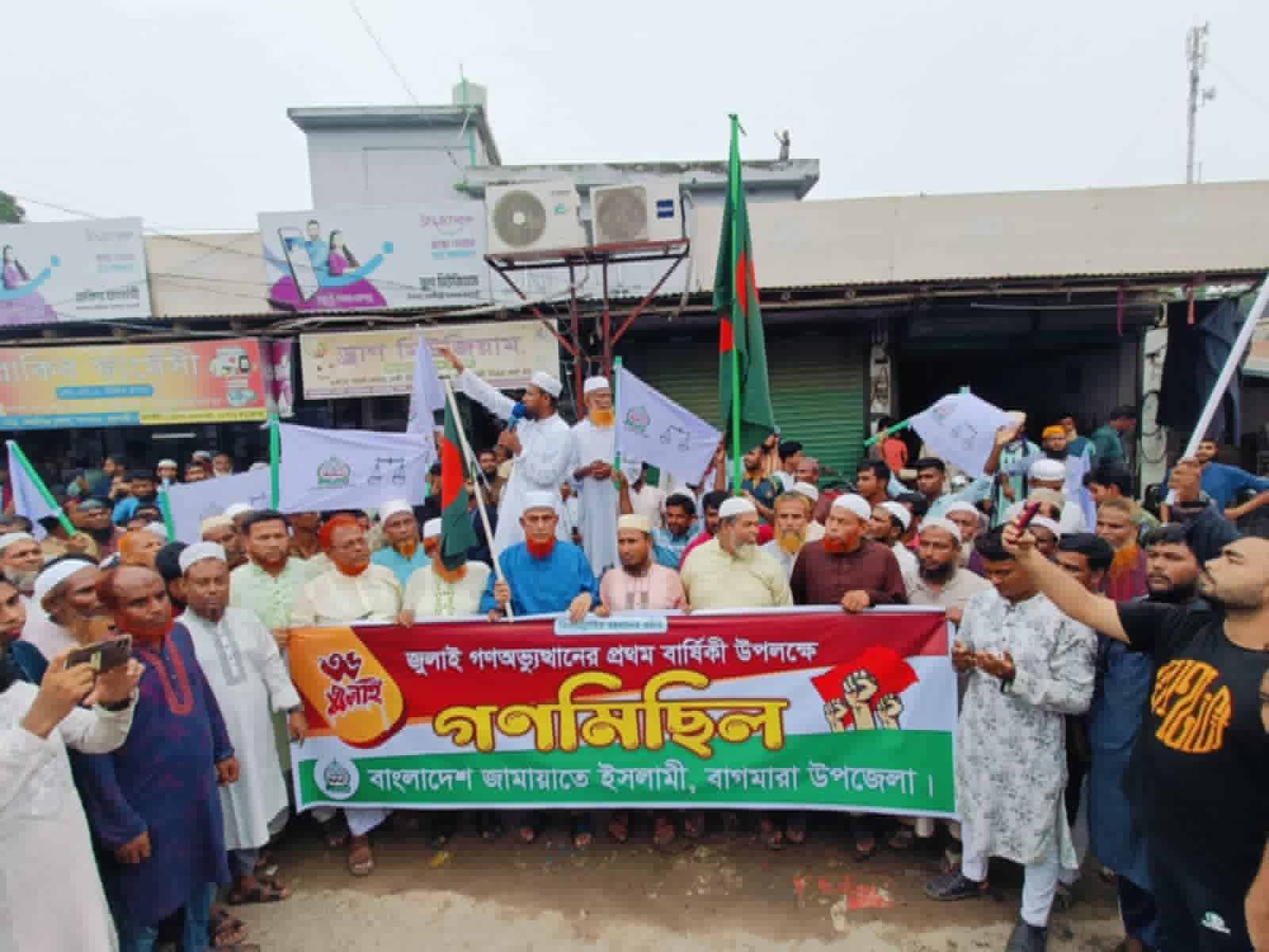 # আশিক ইসলাম,বাগমারা প্রতিনিধিঃ রাজশাহীর বাগমারায় জুলাই অভ্যুত্থানের প্রথম বার্ষিকী উপলক্ষে বাংলাদেশ জামায়াতে ইসলামী বাগমারা উপজেলা শাখার উদ্যোগে এক বর্ণাঢ্য গণমিছিল ও পথসভার আয়োজন করা হয়। মঙ্গলবার বিকেলে ভবানীগঞ্জ গোডাউন মোড় থেকে মিছিলটি শুরু হয়ে ভবানীগঞ্জ বাজারের বিভিন্ন গুরুত্বপূর্ণ সড়ক প্রদক্ষিণ করে পুনরায় গোডাউন মোড়ে এসে পথসভায় মিলিত হয়।