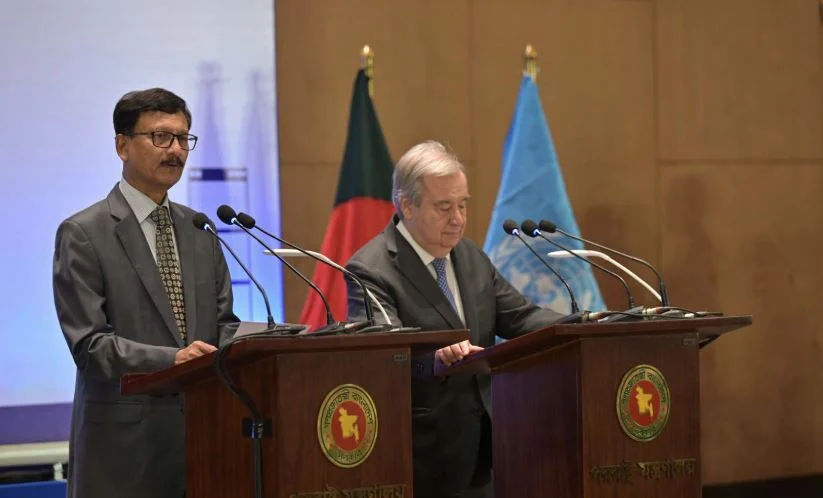 আজ শনিবার রাজধানীর হোটেল ইন্টারকন্টিনেন্টালে জাতিসংঘ মহাসচিবের সঙ্গে যৌথ সংবাদ সম্মেলনে তিনি সাংবাদিকদের বলেন, তার (গুতেরেস) এ সফর ভুল তথ্য ও অপতথ্য প্রচারণা এবং বাংলাদেশকে অস্থিতিশীল করার প্রচেষ্টার বিপরীতে দেশের ইতিবাচক ও শক্তিশালী ভাবমূর্তি গড়ে তুলবে।