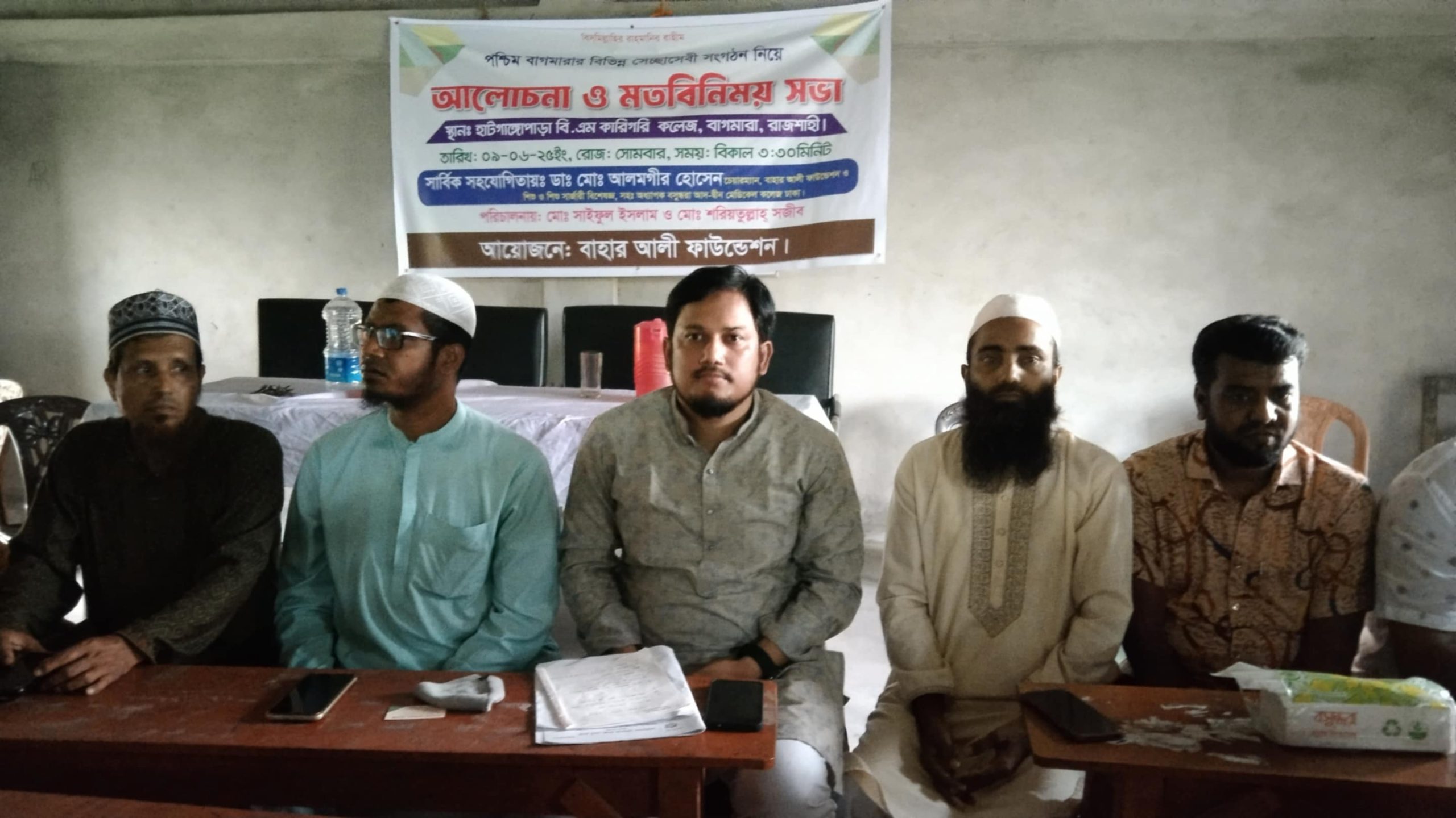 # আশিক ইসলাম বাগমারা প্রতিনিধিঃ রাজশাহীর বাগমারা উপজেলার প্রানকেন্দ্র পশ্চিম বাগমারার বিভিন্ন সেচ্ছাসেবী সংগঠনের সাথে আলোচনা ও মতবিনিময় সভা অনুষ্ঠিত হয়েছে। বাহার আলী ফাউন্ডেশনের আয়োজনে সোমবার (০৯জুন) বিকেল ৪ঘটিকার সময় হাটগাঙ্গোপাড়া বি.এম কারিগরি কলেজে এই আলোচনা সভা অনুষ্ঠিত হয়।