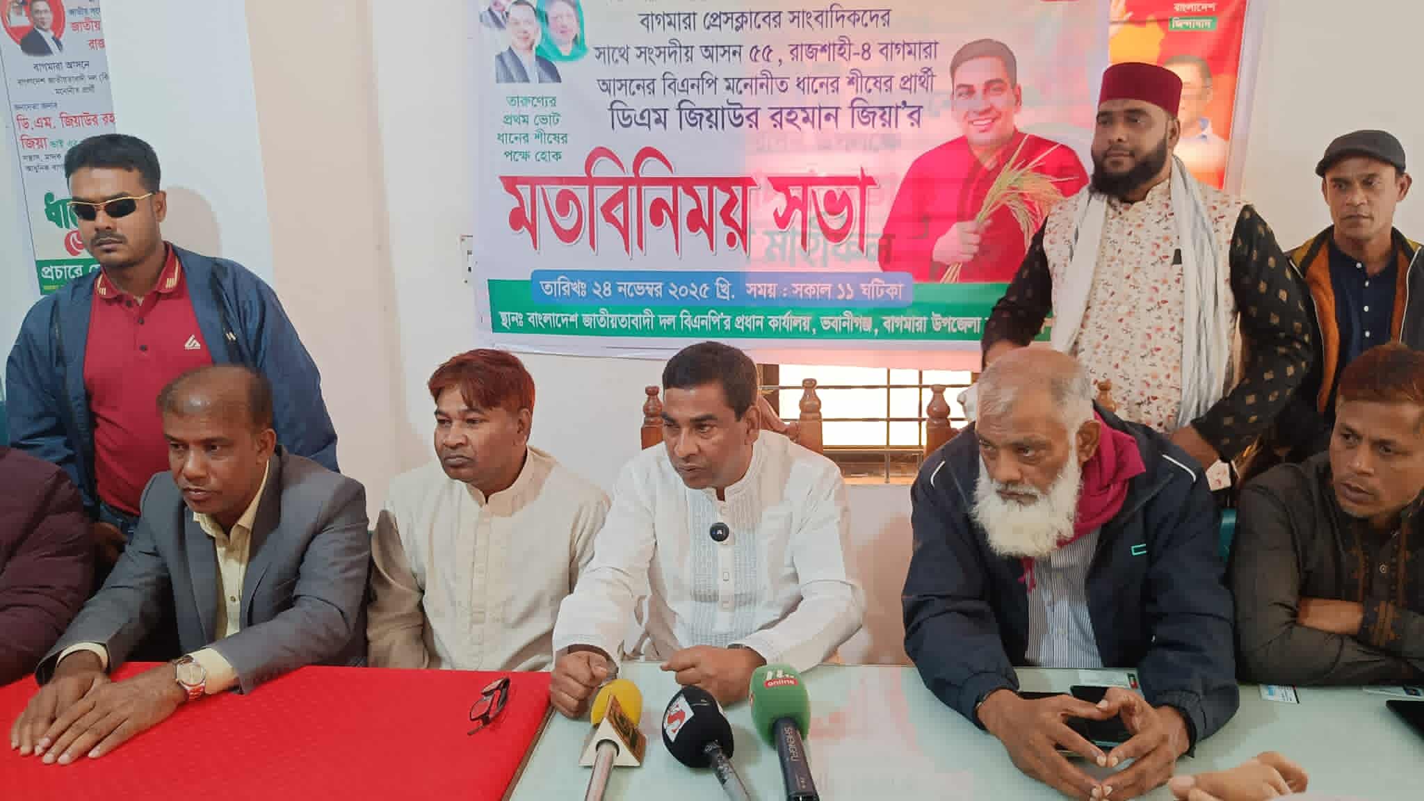 নিজস্ব প্রতিবেদক, বাগমারা: তারুণ্যের প্রথম ভোট, ধানের শীষের পক্ষে হোক।" এই প্রতিপাদ্য " রাজশাহীর বাগমারা প্রেসক্লাবের সদস্যদের সাথে উপজেলা বিএনপির আহবায়ক ও রাজশাহী-৪ বাগমারা আসনের বিএনপি মনোনীত ধানের শীষের প্রার্থী ডিএম জিয়াউর রহমান জিয়া মতবিনিময় করেছেন। সোমবার ২৪ নভেম্বর বেলা সাড়ে বারো'টায় বাগমারা উপজেলা বিএনপির প্রধান কার্যালয়ে এ মতবিনিময় সভা অনুষ্ঠিত হয়।