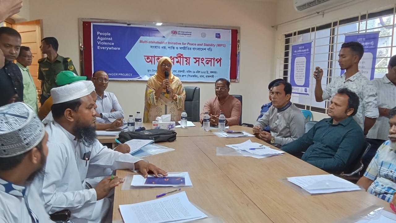 বিশেষ প্রতিনিধিঃ “সংঘাত নয়, শান্তি ও সম্প্রীতির বাংলাদেশ গড়ি” এই প্রতিপাদ্যকে সামনে রেখে রাজশাহীর বাঘা উপজেলায় আন্তঃধর্মীয় সংলাপ অনুষ্ঠিত হয়েছে । দি হাঙ্গার প্রজেক্টের সহযোগিতায় পিস ফ্যাসিলিটেটর গ্রুপ (পিএফজি) বাঘা উপজেলা কমিটি এর আয়োজন করে।
