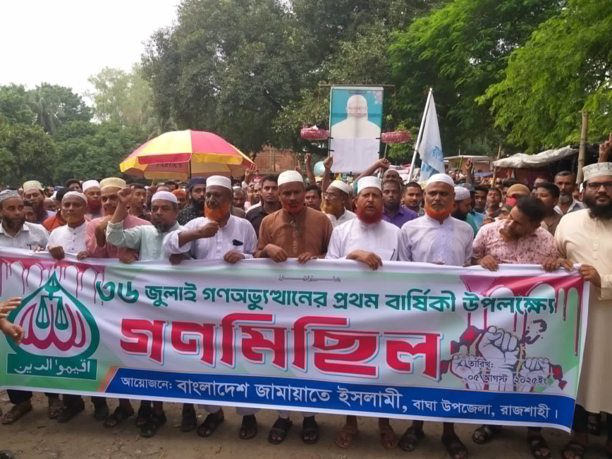 বাঘা (রাজশাহী) প্রতিনিধি ঃ রাজশাহীর বাঘায় জামায়াতে ইসলামী বাংলাদেশ এর আয়োজনে ‘৩৬ জুলাই’ এর প্রথম বছর উদযাপন করা হয়েছে। মঙ্গলবার (৫ আগষ্ট) বিকাল সাড়ে ৫টায় বাঘা শাহী মসজিদ গেট থেকে আনন্দ র্যালি বের হয়। র্যালিটি প্রধান প্রধান সড়ক পদক্ষিণ শেষে বাঘা ফাজিল মাদ্রাসা গেটের সামনে সমাবেশে মিলিত হয়।