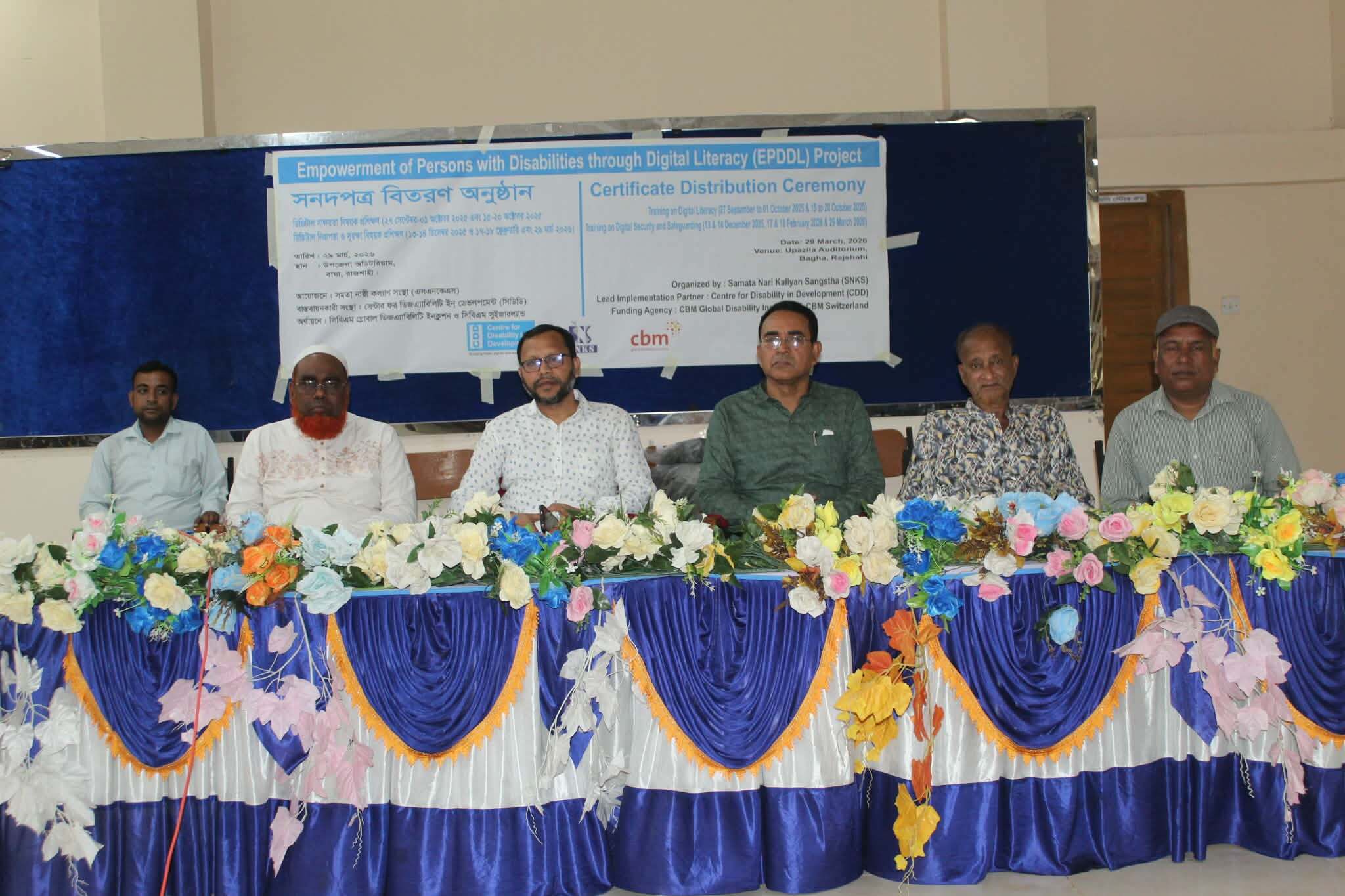 বিশেষ প্রতিনিধি: ডিজিটাল স্বাক্ষরতা, ডিজিটাল নিরাপত্তা ও ডিজিটাল সুরক্ষা বিষয়ক ৫০জন সুবিধাবঞ্চিত(প্রতিবনধী) প্রশিক্ষনার্থীদের মাঝে সনদপত্র, পেনড্রাইভ ও ব্যাগসহ উপকরণ বিতরন করা হয়েছে। রোববার (২৯-০৩-২০২৬) বেসরকারি এনজিও সমতা নারি কল্যান সংস্থা (এসএসকেএস) উপজেলা সম্মেলন কক্ষে এর আয়োজন করে। এতে সভাপতিত্ব করেন সমতা নারি কল্যান সংস্থার নির্বাহি পরিচালক নজরুল ইসলাম।