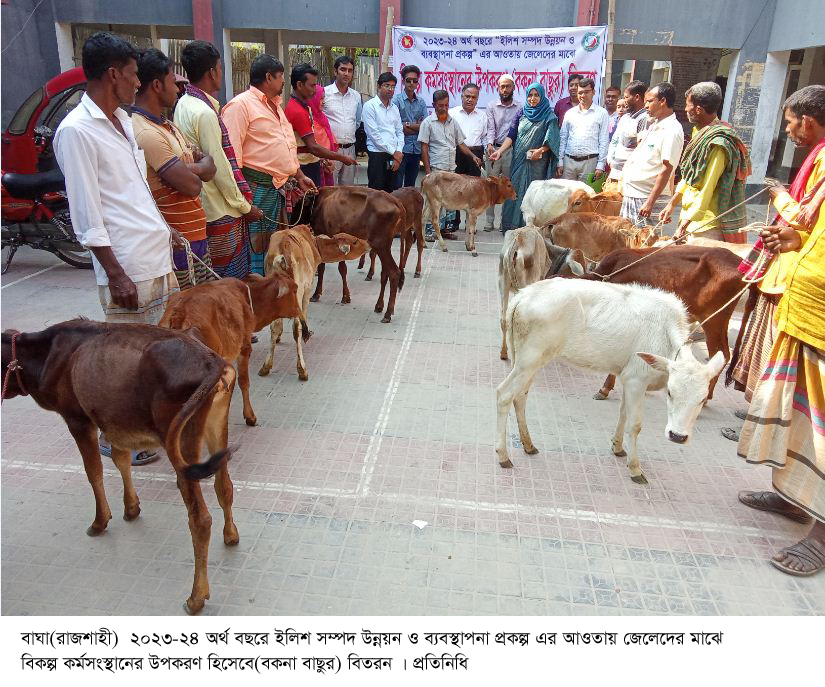 বাঘায় নিবন্ধিত জেলেদের মাঝে বকনা বাছুর বিতরণ