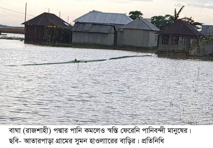 জানা যায়, রাজশাহী বাঘার পদ্মার চরাঞ্চলে এবার বন্যার পানিতে ১৭শ‘ বিঘা জমির আবাদি ফসলসহ গোচরণভূমি ও রাস্তাঘাট তলিয়ে গেছে। বেড়ার অর্ধেক পানিতে ডুবে যায় লক্ষ্মীনগর সরকারি প্রাথমিক বিদ্যালয়। পানিবন্দী হয়ে পড়ে চকরাজাপুর ও গড়গড়ি ইউনিয়নের ২ হাজার ৪শ‘ পরিবার। আতারপাড়া গ্রামের সুমন হাওলাদার জানান,পানি কমলেও তার মতো গ্রামের বেশ কিছু পরিবারের ঘরের পানি এখনো নামেনি। মহিদ ঢালী,ইব্রাহীম হাওলাদার,মাদার ব্যাপারি,জবলু কাজিসহ কয়েকজন জানান,মাঝে মধ্যে ভারি বৃষ্টিপাত থেমে নেই। এতে ঘর থেকে বের হতে পারছিনা।