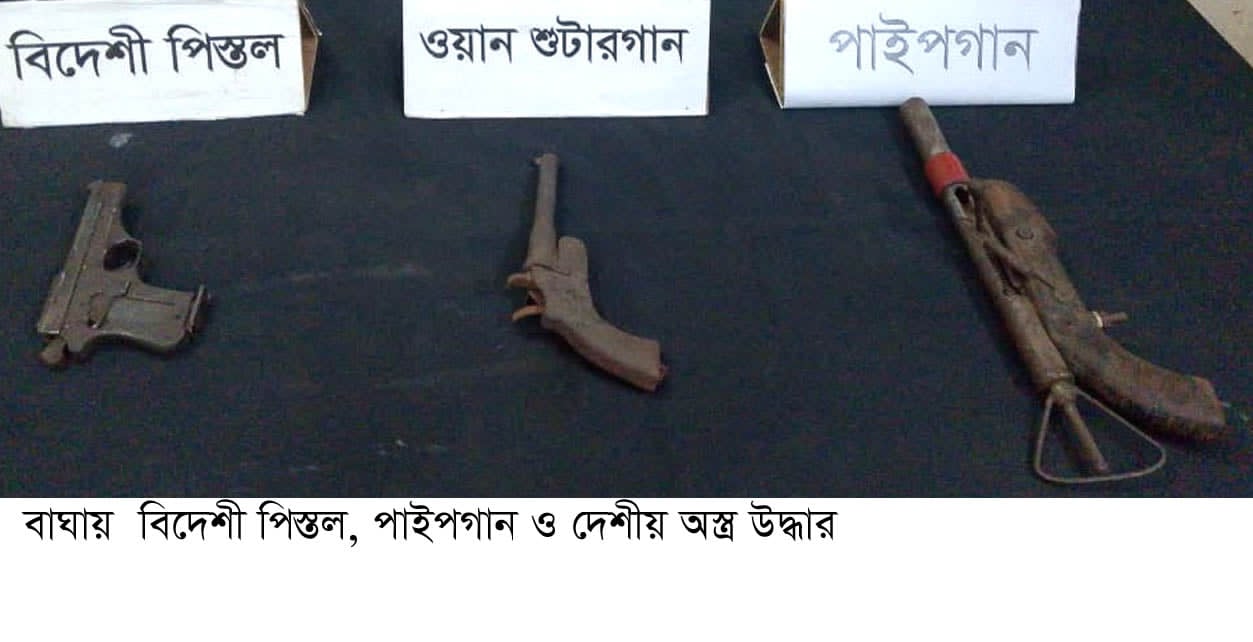 বাঘা ঘানার অফিসার ইনচার্জ (ওসি) আছাদুজ্জামান জানান, উপজেলার গড়গড়ী ইউনিয়ন এর খায়েরহাট চর এলাকা থেকে পুরাতন জংধরা অচল ১টি বিদেশী পিস্তল, ১টি পাইপগান, ১টি ওয়ান শুটারগান এবং ১টি ম্যাগাজিন পরিত্যক্ত অবস্থায় র্যাব-৫ কর্তৃক উদ্ধার করা অস্ত্রগুলো থানায় জিডিমূলে জমা দেন। কোন আটক নেই। ।#