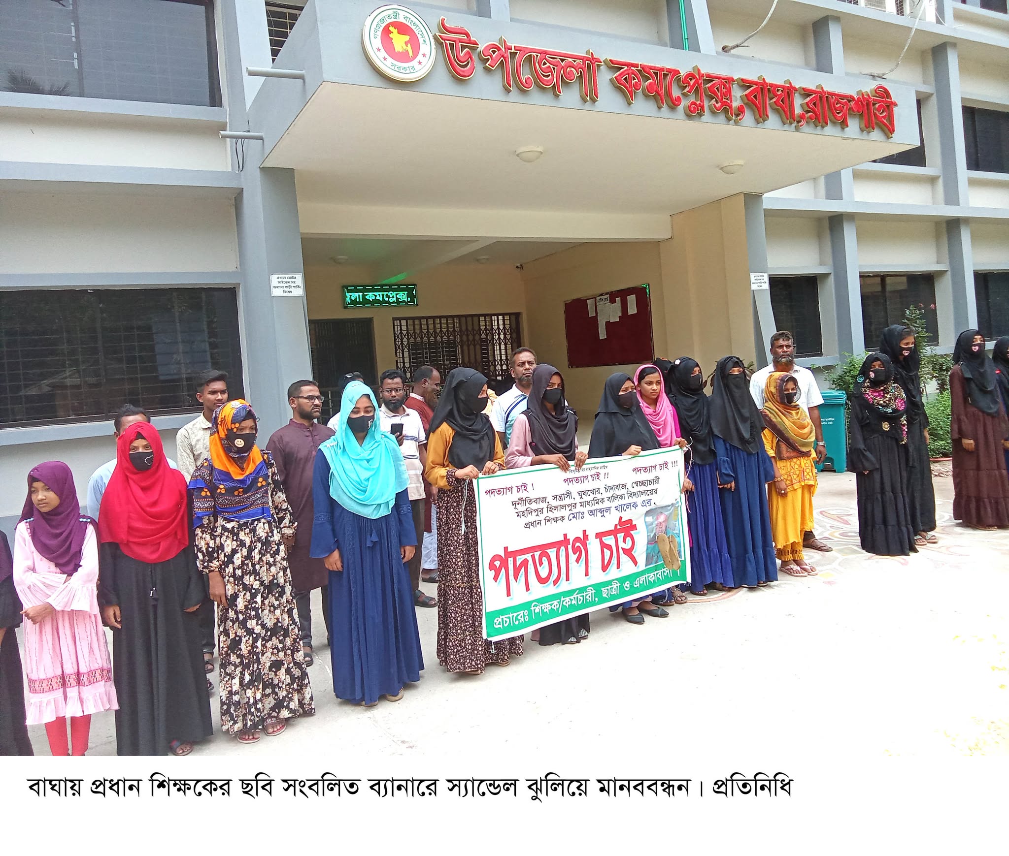 বিশেষ প্রতিনিধি ঃ আগেও প্রধান শিক্ষক আব্দুল খালেককে দুর্নীতিবাজ, সন্ত্রাসী, ঘুষখোর, চাঁদাবাজ ও স্বেচ্ছাচারী হিসেবে আখ্যায়িত করে মানববন্ধন করা হয়েছে। রোববার (০৪-০৫-২০২৫) দুপুরে (১টা ৪মিনিট) একই ব্যানারে আবারো মানববন্ধন কর্মসূচির মাধ্যমে পদত্যাগ দাবি করেছে রাজশাহীর বাঘা উপজেলার মহদিপুর-হরিরামপুর (এম এইচ) বালিকা উচ্চ বিদ্যালয়ের শিক্ষক-কর্মচারি ও শিক্ষার্থীরা। ক্লাস বর্জন করে উপজেলা পরিষদের সামনে প্রধান শিক্ষকের বিরুদ্ধে মানববন্ধন করেছেন তারা।