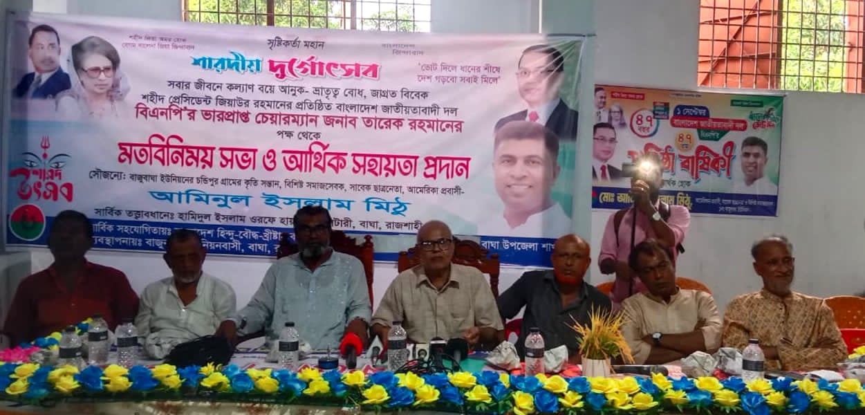 বিশেষ প্রতিনিধি: সনাতন ধর্মালম্বীদের ‘শারদীয় দুর্গোৎসব’ উপলক্ষে মতবিনিময় সভা ও মন্দিরে আর্থিক সহায়তা প্রদান প্রদান করা হয়েছে। বাংলাদেশ জাতীয়তাবাদী দল (বিএনপি)'র ভারপ্রাপ্ত চেয়ারম্যান তারেক রহমানের পক্ষ থেকে আর্থিক সহয়তা প্রদান করেন-বিশিষ্ট সমাজসেবক, সাবেক ছাত্রনেতা, আমেরিকা প্রবাসী আমিনুল ইসলাম মিঠু । তিনি বাঘা উপজেলার বাজুবাঘা ইউনিয়নের চন্ডিপুর গ্রামের অবসরপ্রাপ্ত সেনা অফিসার হামিদুল ইসলাম ওরফে হায়দার মিলিটারির ছেলে।