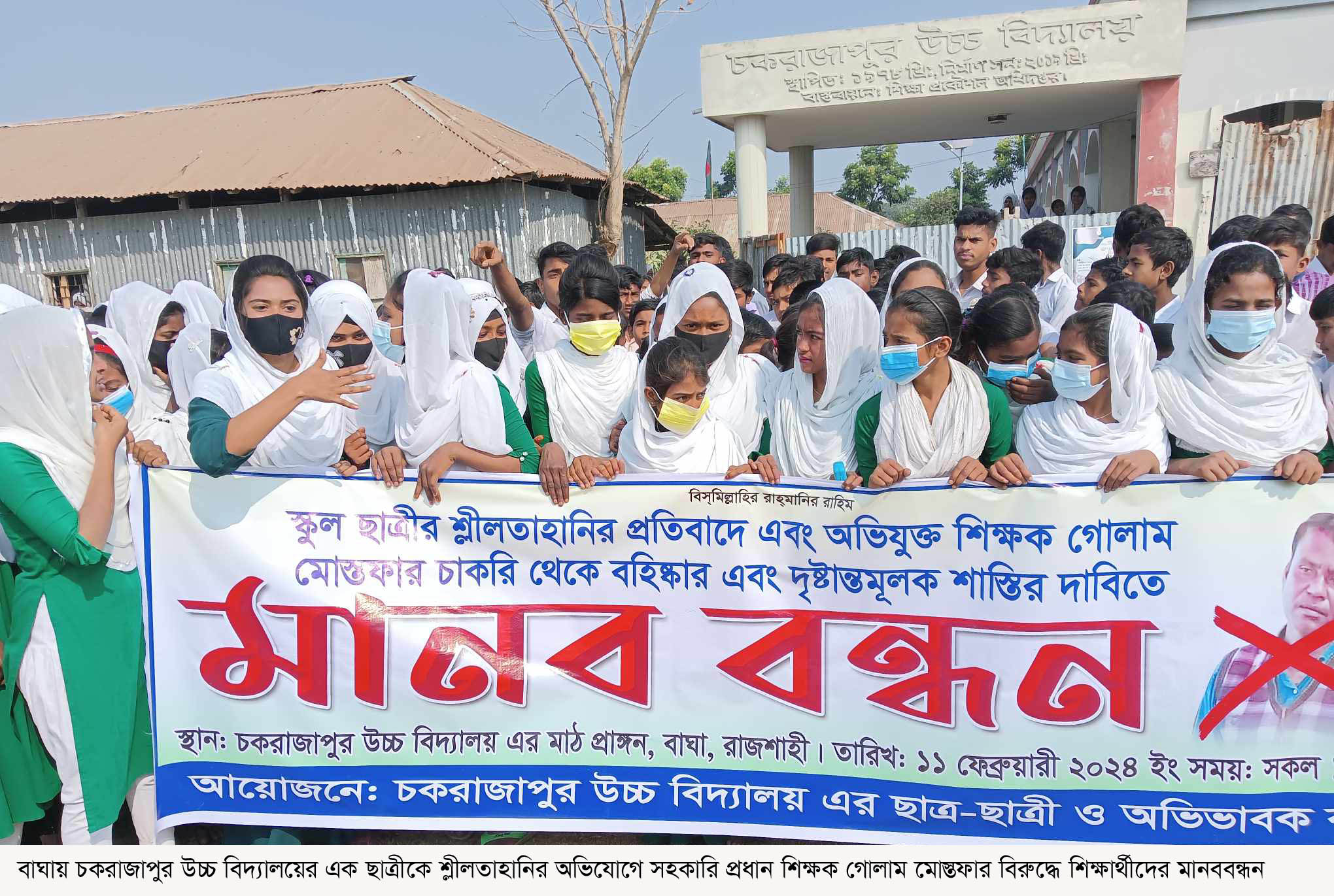 রাজশাহীর বাঘায় মাধ্যমিক বিদ্যালয়ের এক শিক্ষকের বিরুদ্ধে মানববন্ধন করেছে শিক্ষার্থীরা। উপজেলার পদ্মার চরাঞ্চলের চকরাজাপুর উচ্চ বিদ্যালয়ের সহকারি প্রধান শিক্ষক গোলাম মোস্তফার বিরুদ্ধে বিদ্যালয় প্রাঙ্গনে মানববন্ধন কর্মসূচি পালন করেন ওই বিদ্যালয়ের শিক্ষার্থীরা। স্কুলছাত্রীর শ্লীলতাহানির প্রতিবাদে এবং অভিযুক্ত শিক্ষক গোলাম মোস্তাফাকে চাকরি থেকে বহিস্কার ও দৃষ্টান্তমূলক শাস্তির দাবিতে মানববন্ধন করেন তারা। রোববার (১১ ফেব্রুয়ারি) সকাল ১১টায় এই মানববন্ধন অনুষ্ঠিত হয়।