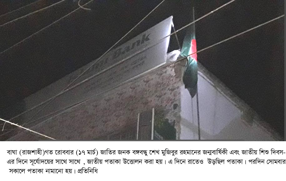 গত রোববার (১৭ মার্চ) জাতির জনক বঙ্গবন্ধু শেখ মুজিবুর রহমানের জন্মবার্ষিকী এবং জাতীয় শিশু দিবস-এর এই দিনে অন্যান্য প্রতিষ্ঠানের মতো রাজশাহীর বাঘা উপজেলায়, ইসলামী এজেন্ট ব্যাংক আড়ানী শাখায় জাতীয় পতাকা উত্তোলন করা হয়। সরকারি নির্দেশনা ছিল এদিন সূর্যোদয়ের সাথে সাথে সকল সরকারি-বেসরকারি ভবনে জাতীয় পতাকা উত্তোলনের। তবে নির্দেশনা মেনে জাতীয় পতাকা উত্তোলন করা হলেও পরে তা আর নামানো হয়নি। সারারাত উড়েছে। সোমবার (১৮-০৩-২০২৪) বিষয়টি নিয়ে সমালোচনার সৃষ্টি হয়েছে। প্রশ্ন উঠেছে কর্তৃপক্ষের দায়িত্ব নিয়ে।