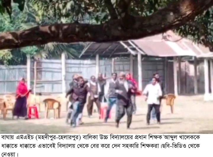 বিদ্যালয়টির প্রধান শিক্ষক আবদুল খালেকের বিরুদ্ধে অভিযোগ করেছেন তারা। এর আগে বিষয়টি নিয়ে বিদ্যালয় প্রাঙ্গণে, প্রধান শিক্ষকের সাথে সহকারি শিক্ষকদের ধাক্কাধাক্কির ঘটনা ঘটে। বিদ্যালয় থেকে প্রধান শিক্ষককে বের করে দেওয়ার অভিযোগও উঠেছে সহকারি শিক্ষকদের বিরুদ্ধে। গত সোমবার (২০ জানুয়ারী) ঘটনাটি ঘটেছে ,রাজশাহীর বাঘা উপজেলার মনিগ্রাম ইউনিয়নের এমএইচ (মহদীপুর-হেলালপুর) বালিকা উচ্চ বিদ্যালয়ে ।