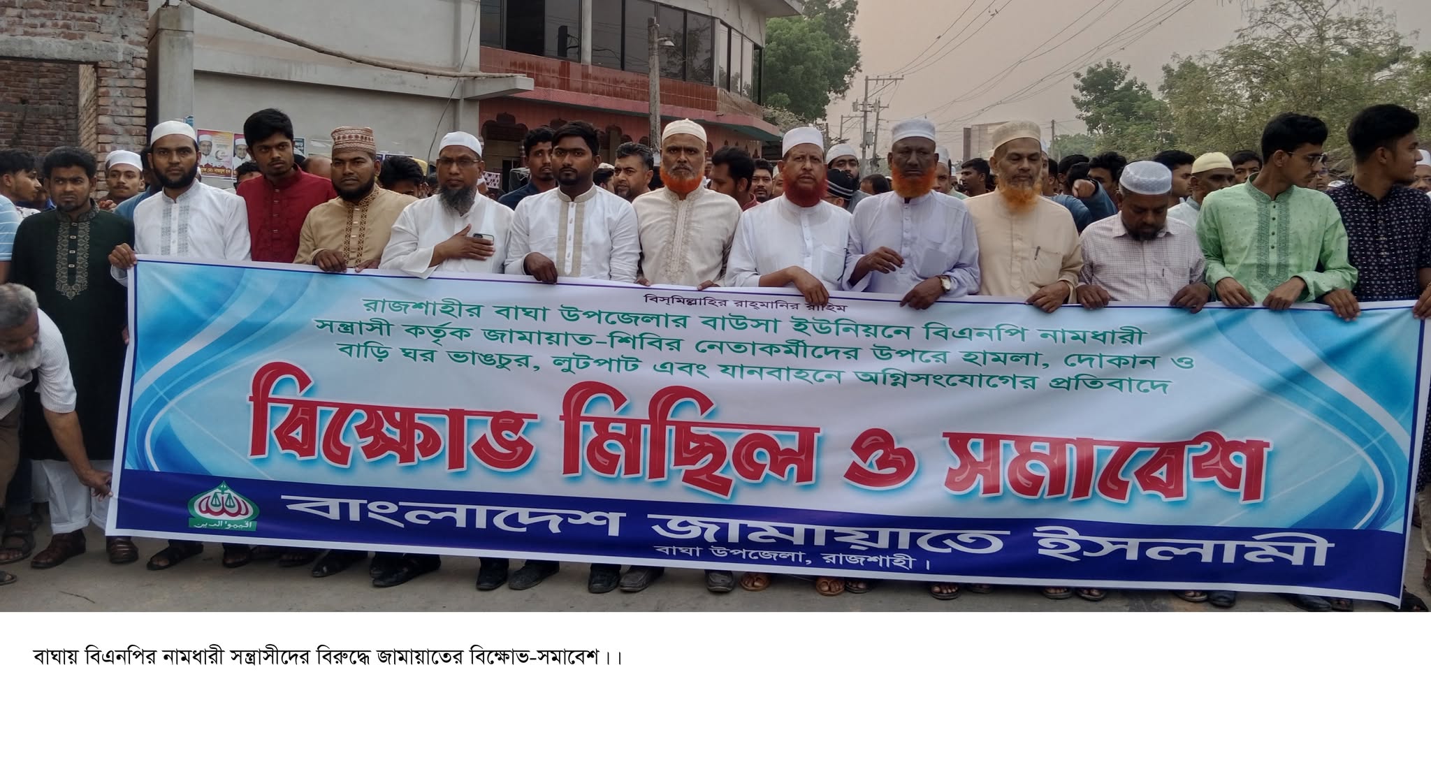 মিছিলে নেতৃত্ব দেন উপজেলা জামায়াতের সাবেক আমির মাওলানা জিন্নাত আলী। বক্তব্যকালে তিনি বলেন, বাঘা উপজেলা বিএনপির সাথে আমাদের মতবিরোধ কিংবা কোন বিরোধ নেই। গত মাসের ২০ মার্চ সাধারন মানুষের অধিকার নিয়ে বাউসা ইউনিয়ন পরিষদের অনিয়ম-দুর্নীতি ও স্বেচ্চাচারিতার বিষয় নিয়ে মানববন্ধন কর্মসূচির আয়োজন করেছিল বাংলাদেশ জামায়াতে ইসলামী বাউসা ইউনিয়ন সংগঠন। কিন্তু শান্তিপূর্ণ মানববন্ধনে বিএনপির নামধারী একদল সন্ত্রাসী জামায়াতের মানববন্ধনে অতর্কিত ভাবে হামলা করে। থনায় অভিযোগের পর বিষয়টি মিমাংসা হলেও গত ৩০ মার্চ ছাত্র শিবির নেতার উপর হামলা, জামায়াত সমর্থিত ব্যবসায়ীদের ব্যবসা প্রতিষ্ঠানে হামলা ভাঙচুর এবং নগদ অর্থ লুটপাট, করে। জামায়াত-শিবির কর্মীদের ব্যবহৃত পাঁচটি মোটরসাইকেলে অগ্নি সংযোগ, ২টি বাই সাইকেল ভাঙচুর করে। উপর্যুপরি আঘাতে আহতদের কয়েকজন চিকিৎসাধীন রয়েছে।