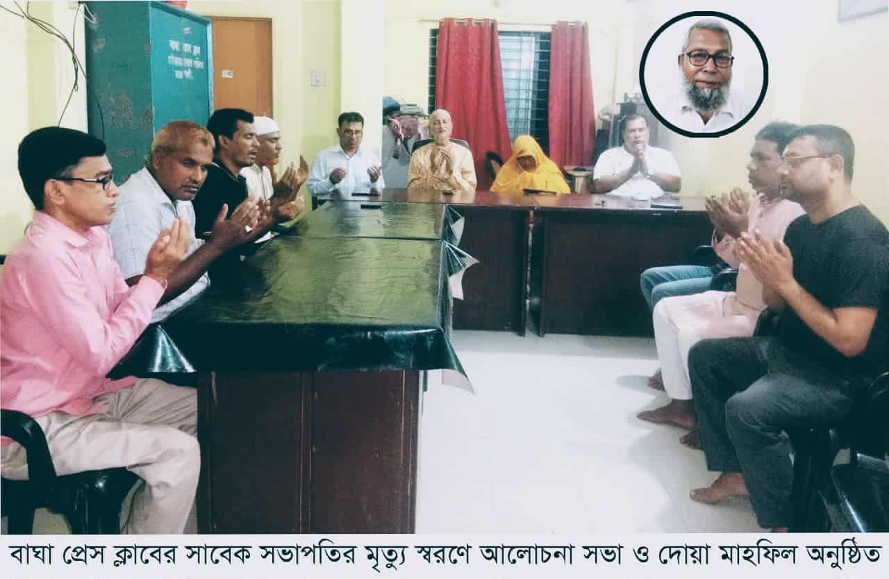 বিশেষ প্রতিনিধি : রাজশাহীর বাঘা প্রেস ক্লাবের সাবেক সভাপতি, অবসরপ্রাপ্ত সহকারি অধ্যাপক আলী মুহাম্মদ হাশেমের মৃত্যু স্বরণে বাঘা প্রেস ক্লাব কার্যালয়ে আলোচনা সভা ও দোয়া মাহফিল অনুষ্ঠিত হয়েছে। রবিবার (২৬ অক্টোবর) বিকেল সাড়ে ৪টায় বাঘা প্রেসক্লাবের আহবায়ক আব্দুল লতিফ মিঞার সভাপতিত্বে ও নুরুজ্জামানের সঞ্চালনায় ৯ম মৃত্যু বার্ষিকীতে স্নৃতিচারন করে বক্তব্য রাখেন, প্রেস ক্লাবের আহবায়ক কমিটির সদস্য- আমানুল হক আমান, আসলাম আলী, আশরাফুল আলম, ফজলুর রহমান মুক্তা ও সাইদুল ইসলাম। দোয়া পরিচালনা করেন আশরাফুল আলম ।