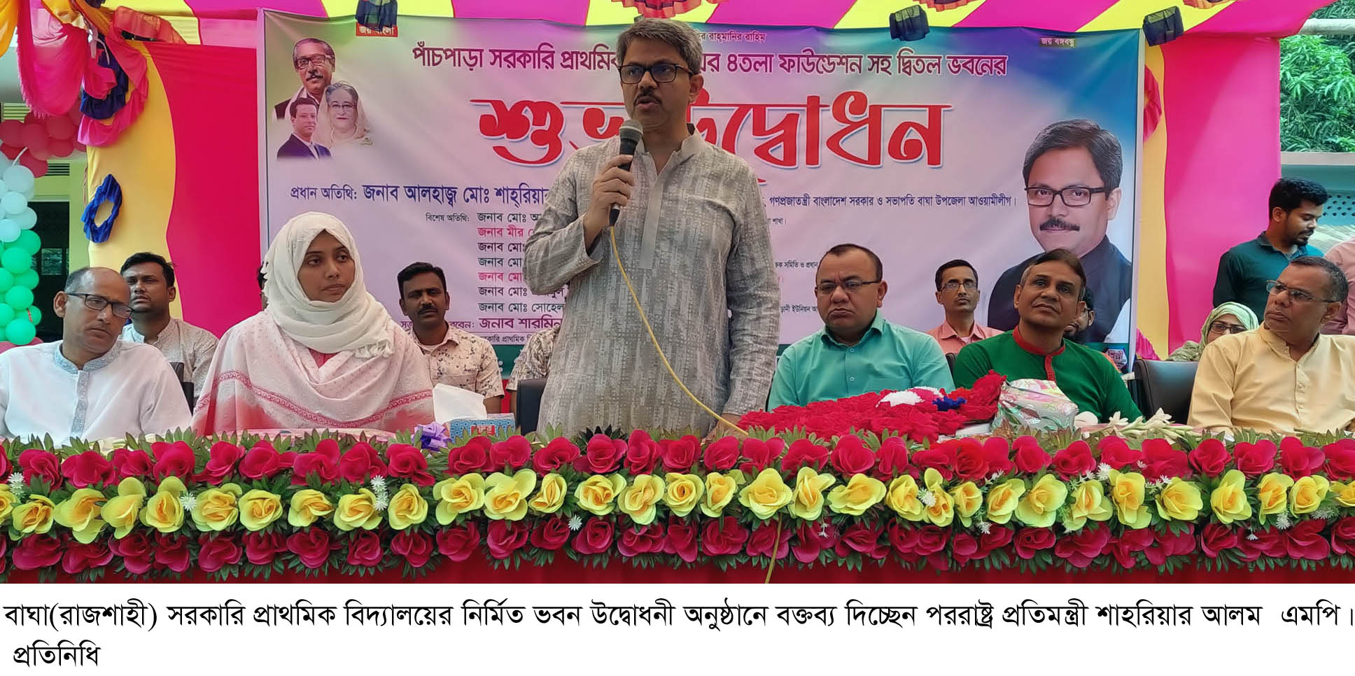 প্রধান মন্ত্রী শেখ হাসিনা হলেন একমাত্র নেতা মন্তব্য করে পররাষ্ট্র মন্ত্রনালয়ের প্রতিমন্ত্রী শাহরিয়ার আলম এমপি(বাঘা-চারঘাট) বলেছেন, যার নের্তৃত্বে শতভাগ বিদ্যুৎায়ন, পাকা রাস্তা এবং শিক্ষা প্রতিষ্ঠানে নতুন ভবন নির্মান-সহ বেশ কিছু মেগা প্রকল্প বাস্তবায়ন করতে সক্ষম হয়েছি। অনেক দেশের চেয়ে আমরা এখন অর্থনৈতিক ভাবে সাবলম্বী। এখন সর্বোচ্চ প্রবৃদ্ধির হিসেব করতে গেলে উন্নয়নশীল তিনটি দেশের মধ্যে বাংলাদেশ একটি। যে কোন পরিস্থিতি মোকাবেলায় শেখ হাসিনার কোন বিকল্প নেই। শনিবার(১-এপ্রিল)বাঘা উপজেলার পাঁচপাড়া সরকারি প্রাথমিক বিদ্যালয়ের ৪তলা ভবনের ফাউন্ডেশন ও নবনির্মিত দ্বীতল ভবন ও পাঁচপাড়া থেকে বাউসা পর্যন্ত পাকাকরণ রাস্তার উদ্বোধনী অনুষ্ঠানে প্রধান অতিথির বক্তব্যেকালে এসব কথা বলেন পররাষ্ট্র প্রতিমন্ত্রী ।