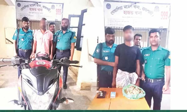 মো: মমিনুল ইসলাম মুন বিশেষ প্রতিনিধি: রাজশাহী মহানগরীতে মোটরসাইকেল চুরি ও চাঁদাবাজি এবং মাদক মামলায় দুইজনকে গ্রেপ্তার করেছে রাজশাহী মেট্রোপলিটন পুলিশের বোয়ালিয়া মডেল থানা পুলিশ। এ সময় একটি চোরাই মোটরসাইকেল ও ৫শ’ গ্রাম গাঁজা উদ্ধার করা হয়। মোটরসাইকেল চুরির অভিযোগে গ্রেপ্তারকৃত মো: জনি (৩৫) রাজশাহী মহানগরীর বোয়ালিয়া মডেল থানার রানীনগর এলাকার মৃত মতিউরের ছেলে। মাদক মামলায় গ্রেপ্তারকৃত মো: পলাশ (৩২) একই থানার কেদুর মোড় এলাকার মো: বাবলুর ছেলে।