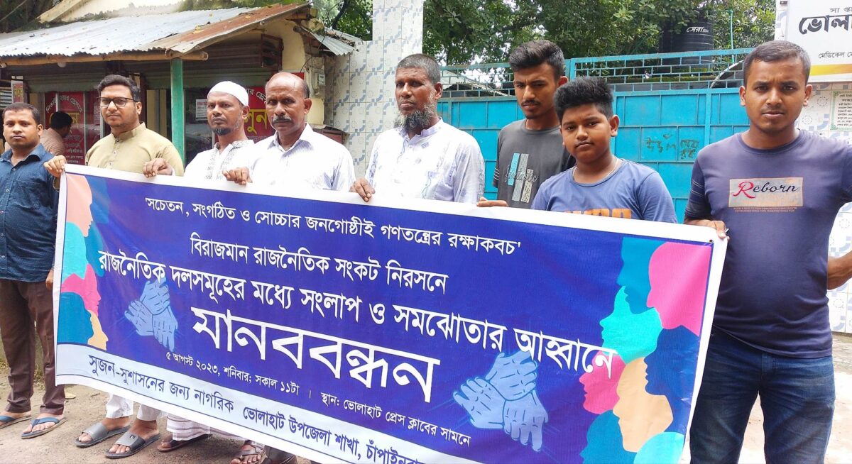 চাঁপাইনবাবগঞ্জের ভোলাহাটে বিরাজমান রাজনৈতিক সংকট নিরসনে রাজনৈতিক দলসমূহের মধ্যে সংলাপ ও সমঝোতার আহবানে মানববন্ধন কর্মসূচি পালিত হয়েছে। শনিবার (৫ আগস্ট ২০২৩) সকাল ১১ টার সময় মেডিকেল মোড়স্থ ভোলাহাট প্রেস ক্লাবের সামনে এই মানববন্ধন কর্মসূচি পালন করা হয়।