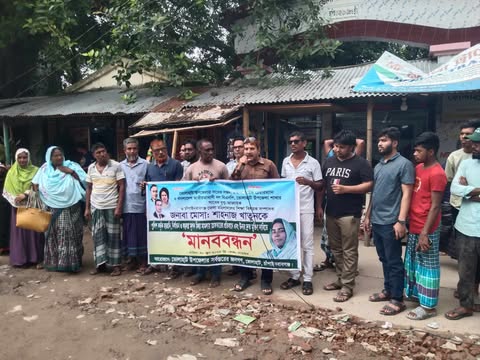 # এম. এস. আই শরীফ, ভোলাহাট (চাঁপাইনবাবগঞ্জ) প্রতিনিধিঃ চাঁপাইনবাবগঞ্জের ভোলাহাটে সাবেক উপজেলা মহিলা ভাইস চেয়ারম্যান, বিএনপি নেত্রী ও সাংবাদিক, চাঁপাইনবাবাগঞ্জ জেলা মহিলাদলের শিক্ষা বিষয়ক সম্পাদক শাহনাজ খাতুনকে মিথ্যা মামলায় জড়িয়ে হয়রানী, নির্যাতন ও ষড়যন্ত্রমূলক পুলিশ গ্রেফতার করার প্রতিবাদে ও তার নিঃশর্ত মুক্তির দাবীতে স্থানীয় এলাকাবাসীর মানববন্ধন করে সোমবার বেলা সাড়ে ১১টায় (৩০ জুন ২০২৫) উপজেলার প্রাণকেন্দ্র সন্ন্যাসীতলার প্রেসক্লাবের সামনে।