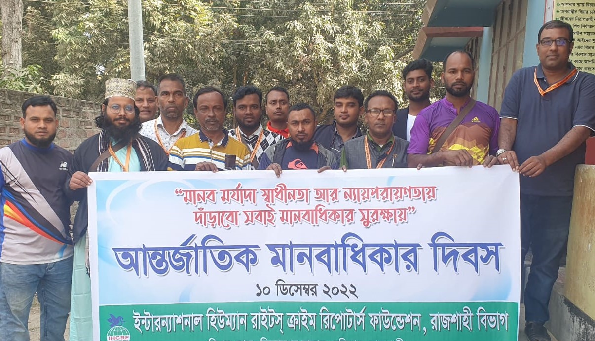 আজ ১০ ডিসেম্বর ২০২২ শনিবার দুপুর ১২টায় ইন্টারন্যাশনাল হিউম্যান রাইটস ক্রাইম রিপোর্টার্স ফাউন্ডেশন, রাজশাহী বিভাগীয় কার্যালয়ের উদ্যোগে বিহাস মোড়ে (চৌদ্দপাই, মতিহার, বিনোদপুর, মতিহার, রাজশাহী) আন্তর্জাতিক মানবাধিকার দিবস উদযাপন হয়।