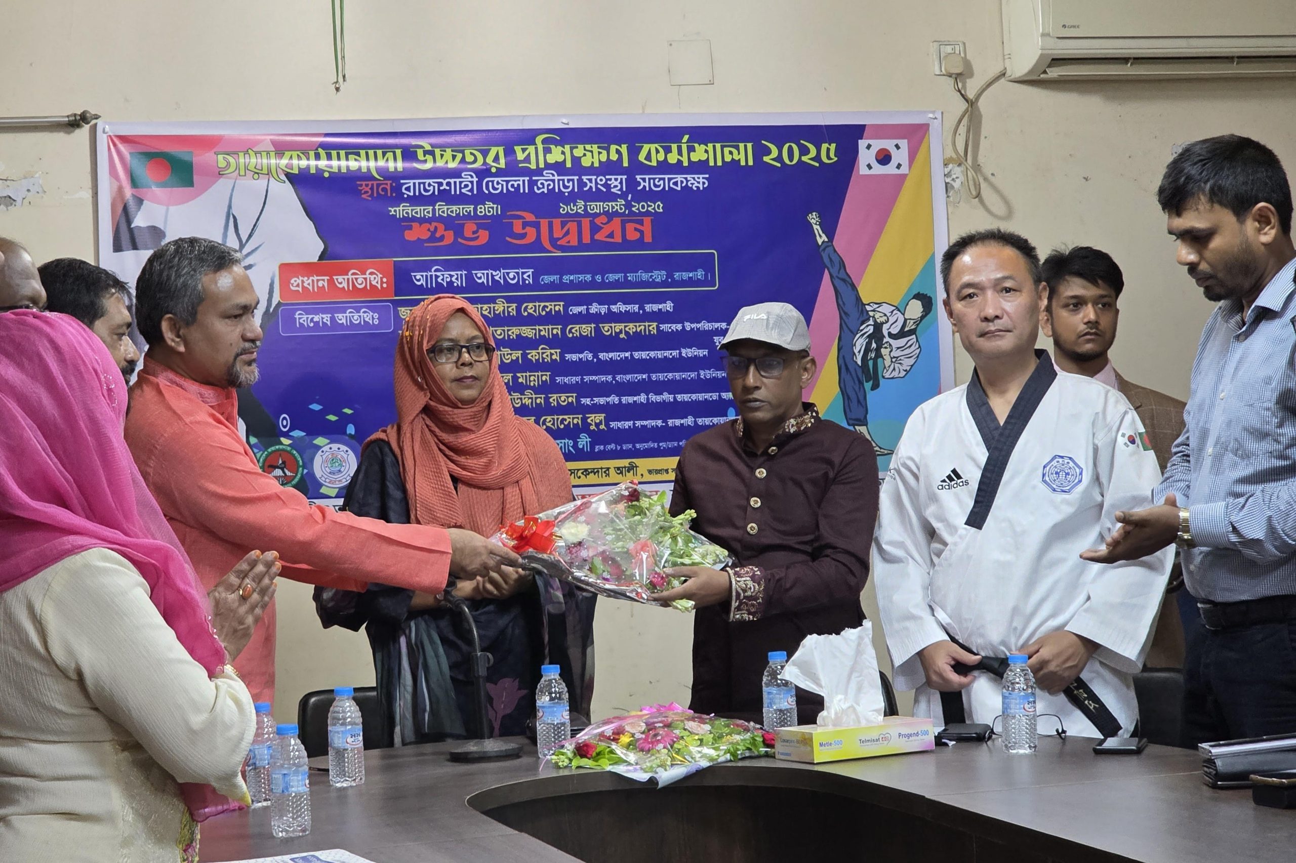 আয়োজন করেছে রাজশাহী বিভাগীয় তায়কোয়ানদো এসোসিয়েশন, অনুমোদনে বাংলাদেশ তায়কোয়ানদো ফেডারেশন, ট্রেনিং সাপোর্টে বাংলাদেশ তায়কোয়ানদো ইউনিয়ন, এবং সার্বিক সহযোগিতায় জেলা ক্রীড়া সংস্থা, রাজশাহী।প্রশিক্ষণ কর্মশালা আগামী ১৬ই আগস্ট ২০২৫ইং থেকে ২২ই আগস্ট ২০২৫ইং তারিখ পর্যন্ত মোট সাতদিন চলবে, যেখানে অংশগ্রহণকারীরা কৌশলগত দক্ষতা, শৃঙ্খলা এবং আন্তর্জাতিক মানদণ্ডে প্রতিযোগিতার প্রস্তুতি গ্রহণ করবে।#