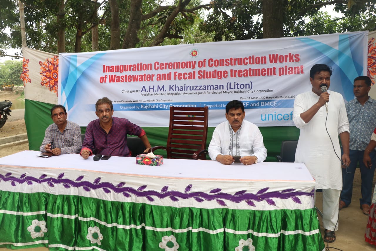 রাজশাহীতে দেশের প্রথম মিনি ওয়েস্ট ওয়াটার এন্ড ফিকেল স্লাজ ট্রিটমেন্ট প্লান্ট নির্মাণ কাজের উদ্বোধন করা হয়েছে। রোববার দুপুরে ২নং ওয়ার্ডে আশ্রয়ণ প্রকল্প এলাকায় এই প্লান্ট নির্মাণ কাজের আনুষ্ঠানিক উদ্বোধন করা হয়। ইউনিসেফ এবং বিল এন্ড মিলিন্ডা গেটস ফাউন্ডেশন (বিএফজিএফ) এর সহযোগিতায় ২০ লাখ টাকায় এ প্রকল্পটি বাস্তবায়িত করছে রাজশাহী সিটি কর্পোরেশন। এই প্লান্টে ৪০টি পরিবারের গৃহস্থালী কাজে ব্যবহৃত পানি ও মানববর্জ্য পরিশোধন করে পুনঃ ব্যবহার উপযোগী করা হবে জানিয়েছেন প্রকল্প সংশ্লিষ্টরা।