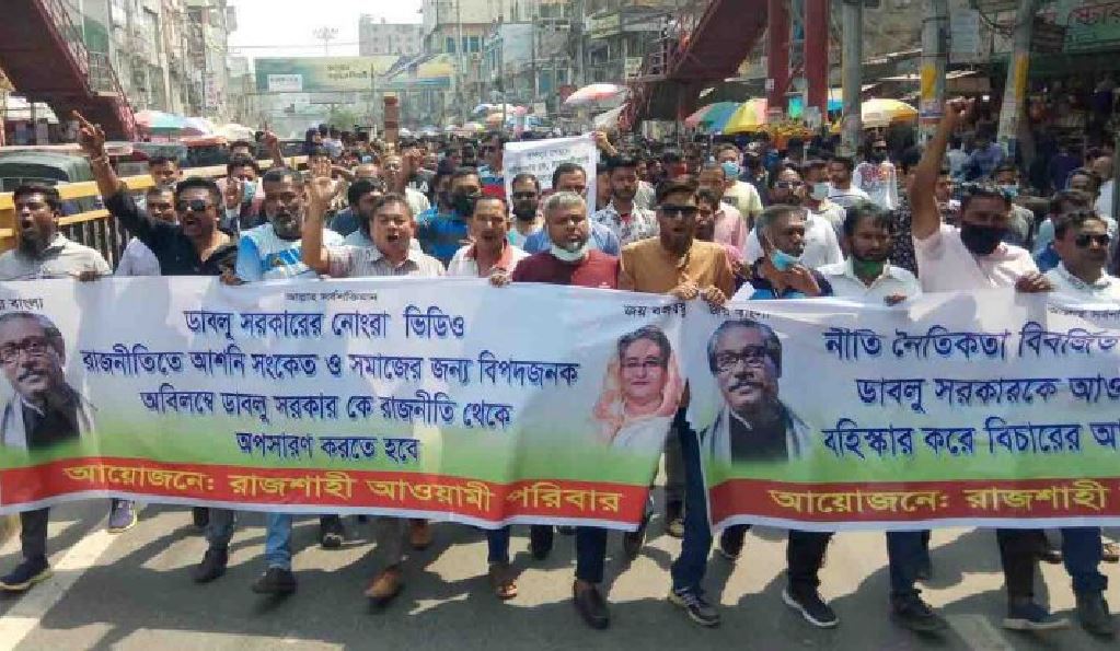 রাজশাহী মহানগর আওয়ামী লীগের সাধারণ সম্পাদক ডাবলু সরকারের অপসরণ দাবিতে এবার ‘রাজশাহী আওয়ামী পরিবারের’ ব্যানারে বিক্ষোভ মিছিল ও মানববন্ধন করা হয়েছে। গতকাল শনিবার দুপুরে মহানগরীর জিরোপয়েন্টে এ মানববন্ধন অনুষ্টিত হয়। এসময় ডাবলু সরকারকে দল থেকে বহিস্কারের দাবি জানানো হয়। এরআগে শনিবার সকাল থেকে আওয়ামী পরিবারের ব্যানারে প্রায় ৫ শতাধিক লোকজন নগরীর জিরোপয়েন্টের বড় মসজিদের সামনে জড় হয়। সেখান থেকে জিরোপয়েন্টে ডাবলু সরকারের বিরুদ্ধে মানববন্ধন করা হয়।
