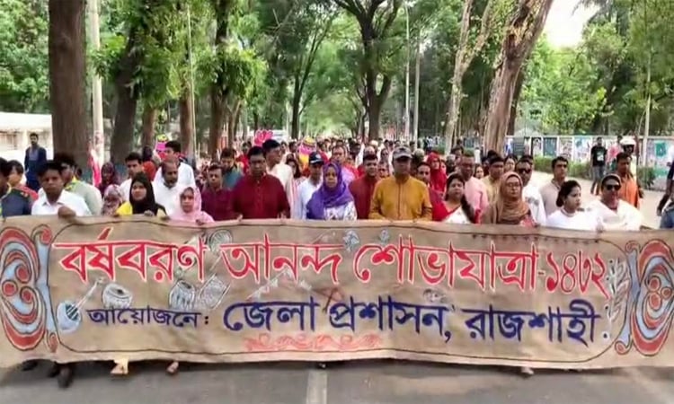 রাজশাহী জেলা প্রশাসনের আয়োজনে নগরীর সিএন্ডবির মোড় থেকে বর্ষবরণ আনন্দ শোভাযাত্রা শুরু হয়ে শিশু একাডেমীতে এসে মিলিত হয় সকাল সাড়ে ৭টায়। বাঙালি ঐতিহ্যের অনুষঙ্গ নিয়ে এ র্যালিতে অংশগ্রহণ করেন আরএমপি কমিশনার, জেলা প্রশাসকসহ প্রশাসনের ঊর্ধ্বতন কর্মকর্তারা। অংশ নেন নারী পুরুষসহ বিভিন্ন শ্রেণী পেশার মানুষ।