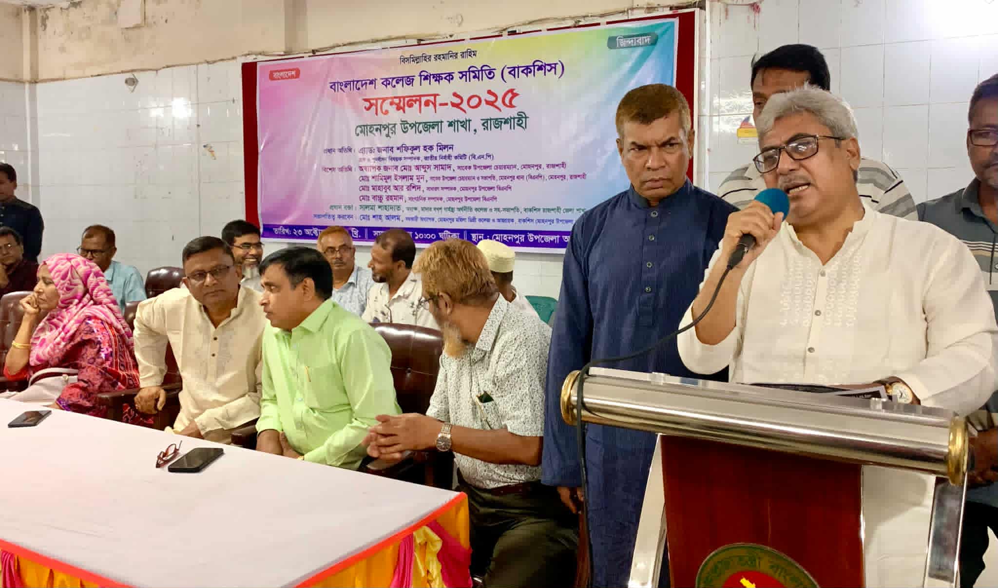 নিজস্ব প্রতিবেদক: রাজশাহীতে বাংলাদেশ কলেজ শিক্ষক সমিতি (বাকশিস) মোহনপুর উপজেলা শাখার সম্মেলন অনুষ্ঠিত হয়েছে। (২৩ অক্টোবর) দুপুরে মোহনপুর উপজেলা অডিটোরিয়ামে এই সম্মেলন অনুষ্ঠিত হয়। সম্মেলনের প্রধান অতিথি ছিলেন বিএনপির জাতীয় নির্বাহী কমিটির ত্রাণ ও পুনর্বাসন বিষয়ক সম্পাদক অ্যাডভোকেট শফিকুল হক মিলন। অনুষ্ঠানে সভাপতিত্ব করেন মোহনপুর মহিলা ডিগ্রি কলেজের সহকারী অধ্যাপক মো. শাহ্ আলম। প্রধান বক্তা হিসেবে উপস্থিত ছিলেন বাকশিস রাজশাহী জেলা শাখার সহ-সভাপতি ও মাদার বখ্শ গার্হস্থ্য অর্থনীতি কলেজের অধ্যক্ষ সালমা শাহাদাত।