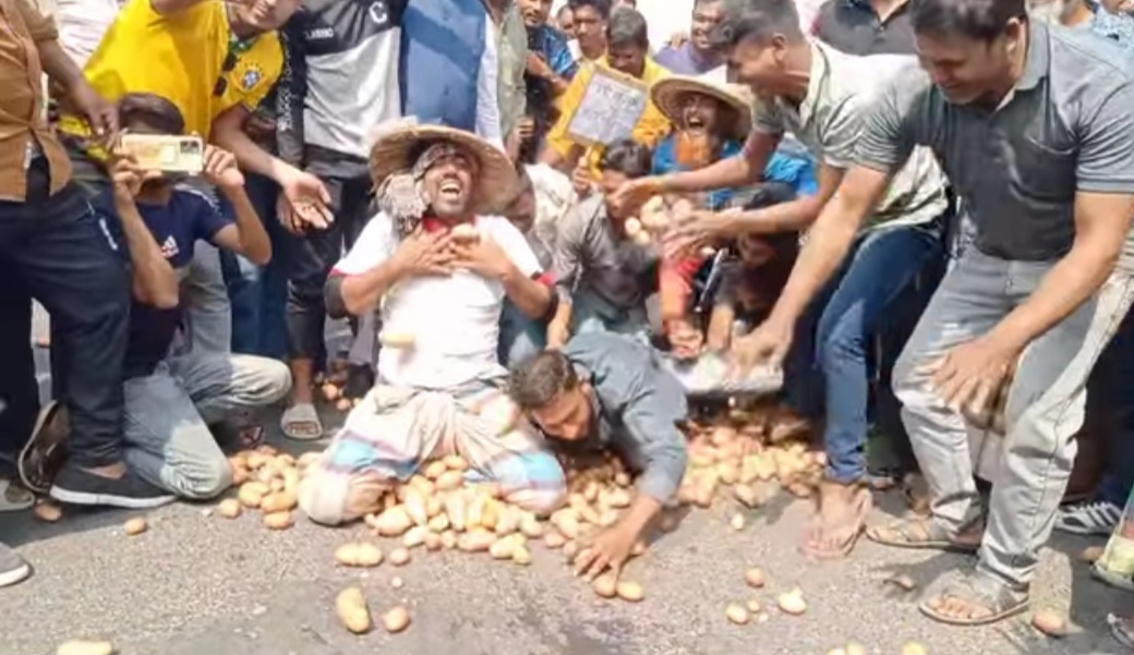 রাজশাহীতে ভাড়া বৃদ্ধির প্রতিবাদে সড়কে আলু ফেলে কৃষকদের বিক্ষোভ