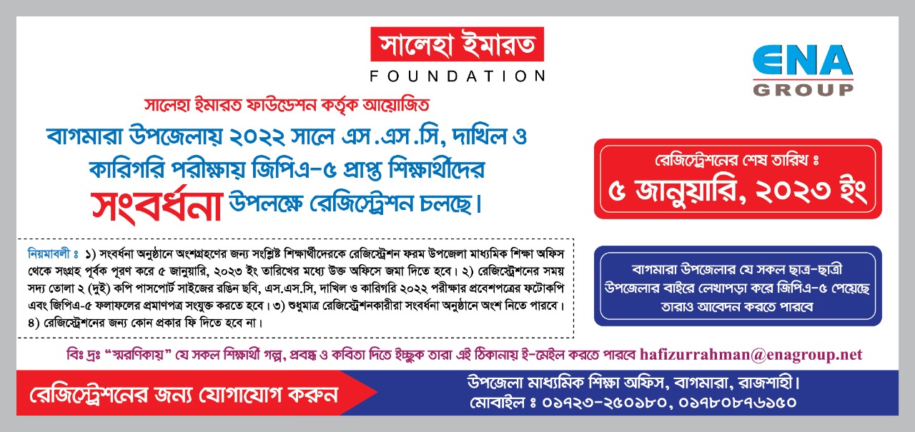 রাজশাহীর বাগমারায় সালেহা ইমারত ফাউন্ডেশনের উদ্যোগে জিপি এ – ৫ প্রাপ্তদের সংবর্ধনা রেজিষ্ট্রেশন শুরু