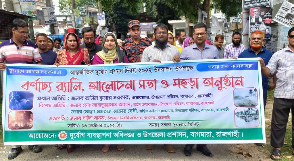 দুর্যোগে আগাম সতর্কবার্তা সবার জন্য কার্যব্যবস্থা এ প্রতিপাদ্যেকে সামনে রেখে রাজশাহীর বাগমারায় আন্তর্জাতিক দুর্যোগ প্রশমন দিবস পালিত হয়েছে।
