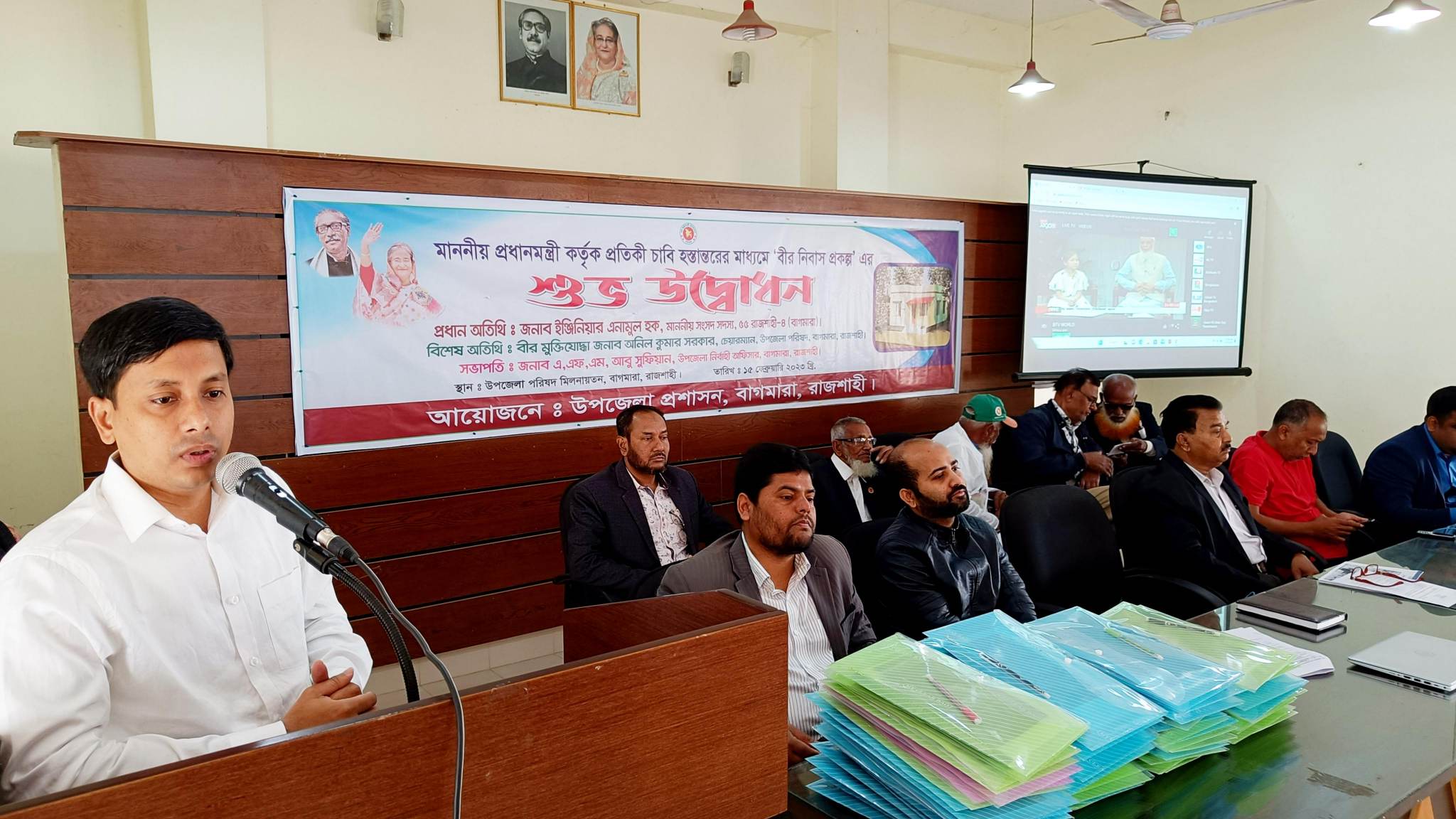 মুক্তিযুদ্ধ বিষয়ক মন্ত্রণালয়ের বাস্তবায়নাধীন অস্বচ্ছল বীর মুক্তিযোদ্ধাদের জন্য ‘ বীর নিবাস’ প্রকল্পের আওতায় বীর মুক্তিযোদ্ধাদের বাড়ি নির্মাণ করা হচ্ছে। এরই মধ্যে যে সকল বীর নিবাসের কাজ শেষ হয়েছে সেগুলোর চাবি হস্তান্তর করা হলো। একতলা বিশিষ্ট প্রতিটি বীর নিবাসের ব্যয় ধরা হয়েছে প্রায় ১৪ লাখ টাকা। উপজেলা নির্বাহী কর্মকর্তা এ,এফ,এম, আবু সুফিয়ানের সভাপতিত্বে অস্বচ্ছল বীর মুক্তিযোদ্ধাদের মাঝে বীর নিবাসের প্রতিকী চাবি হস্তান্তর উপলক্ষে প্রশাসনের আয়োজনে বাগমারা উপজেলা পরিষদ মিলনায়তনে এক অনুষ্ঠানের আয়োজন করা হয়।