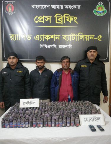 র্যাবের প্রেস বিজ্ঞপ্তিতে এ তথ্যৗ নিশ্চিত করে জানানো হয়েছে, রাজশাহী জেলার চারঘাট থানাধীন রাওথা (দাড়িপাড়া) গ্রামস্থ মাদক ব্যবসায়ী শাহাবুল (৩৫) এর বসত বাড়ীতে অবৈধ মাদকদ্রব্য ফেন্সিডিল মজুদ আছে। সেই সংবাদ সুত্রে ঘটনাস্থলের বাড়িতে পৌঁছামাত্রই র্যাবের উপস্থিতি টের পেয়ে ২ জন ব্যক্তি দৌড়ে পালানোর চেষ্টাকালে সঙ্গীয় ফোর্সের সহায়তায় ঘটনাস্থলেই তাদেরকে আটক করে। আসামীর বিরুদ্ধে রাজশাহীর চারঘাট থানায় ১৯৭৪ এর ২৫ এর (১)(ন)/২৫ ধারায় মামলা রুজুর কার্যক্রম প্রক্রিয়াধীন।#