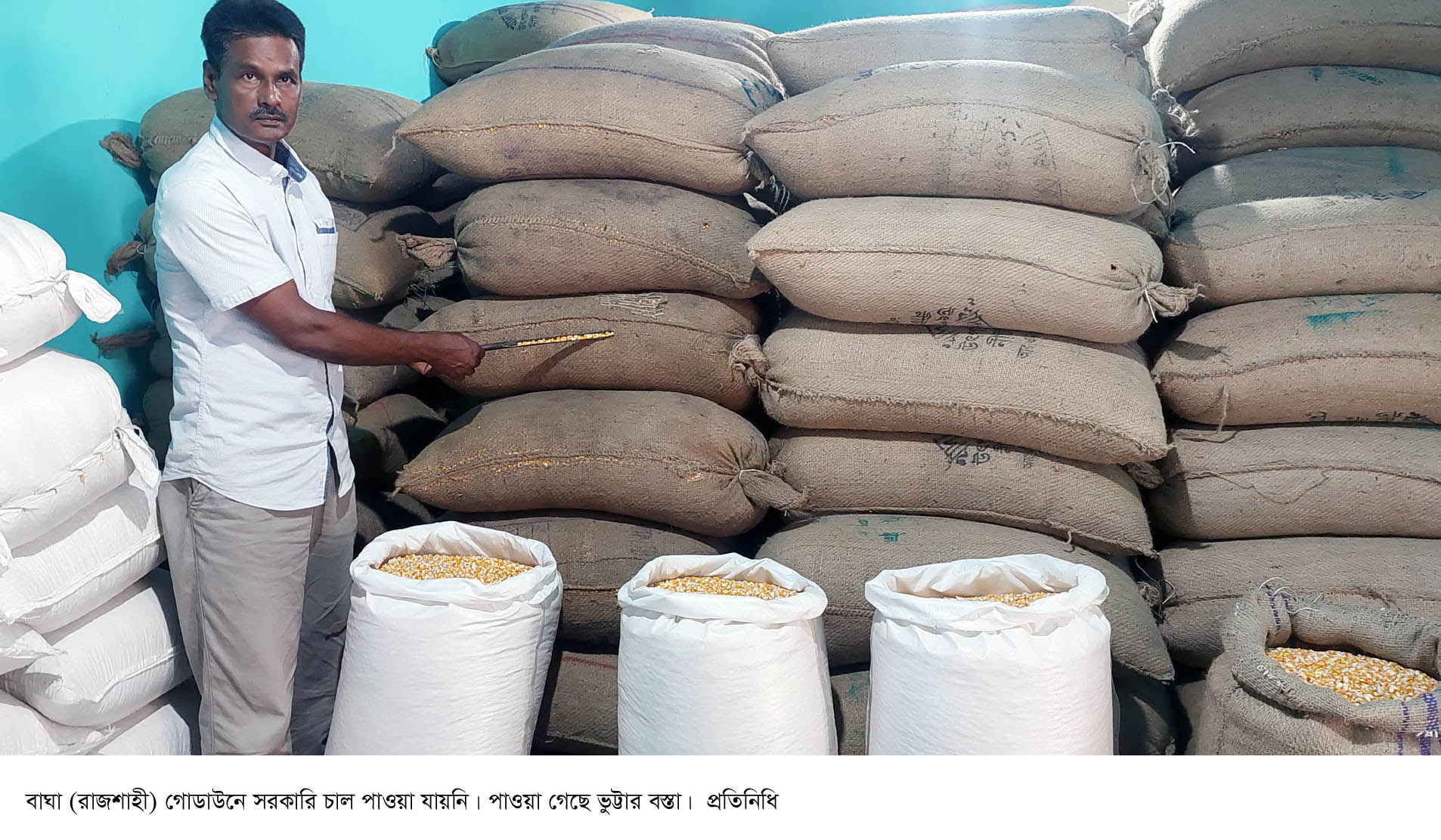 রাজশাহীর বাঘায় সরকারি ভি.জি.এফ’র চাল মজুদের খবরে শনিবার(২৯-এপ্রিল) দুপুরে বাঘা পৌর সভার নারায়নপুর বাজারস্থ গোডাউনে অভিযান চালানো হয়। সেখানে চালের পরিবর্তে ভুট্টার বস্তা পাওয়া গেছে। গোডাউনটি পৌর মেয়র আক্কাছ আলীর বলে জানা গেছে। সেটি দেখভাল করে পৌর মেয়রের সহোদর ভাই সাবদার আলী।