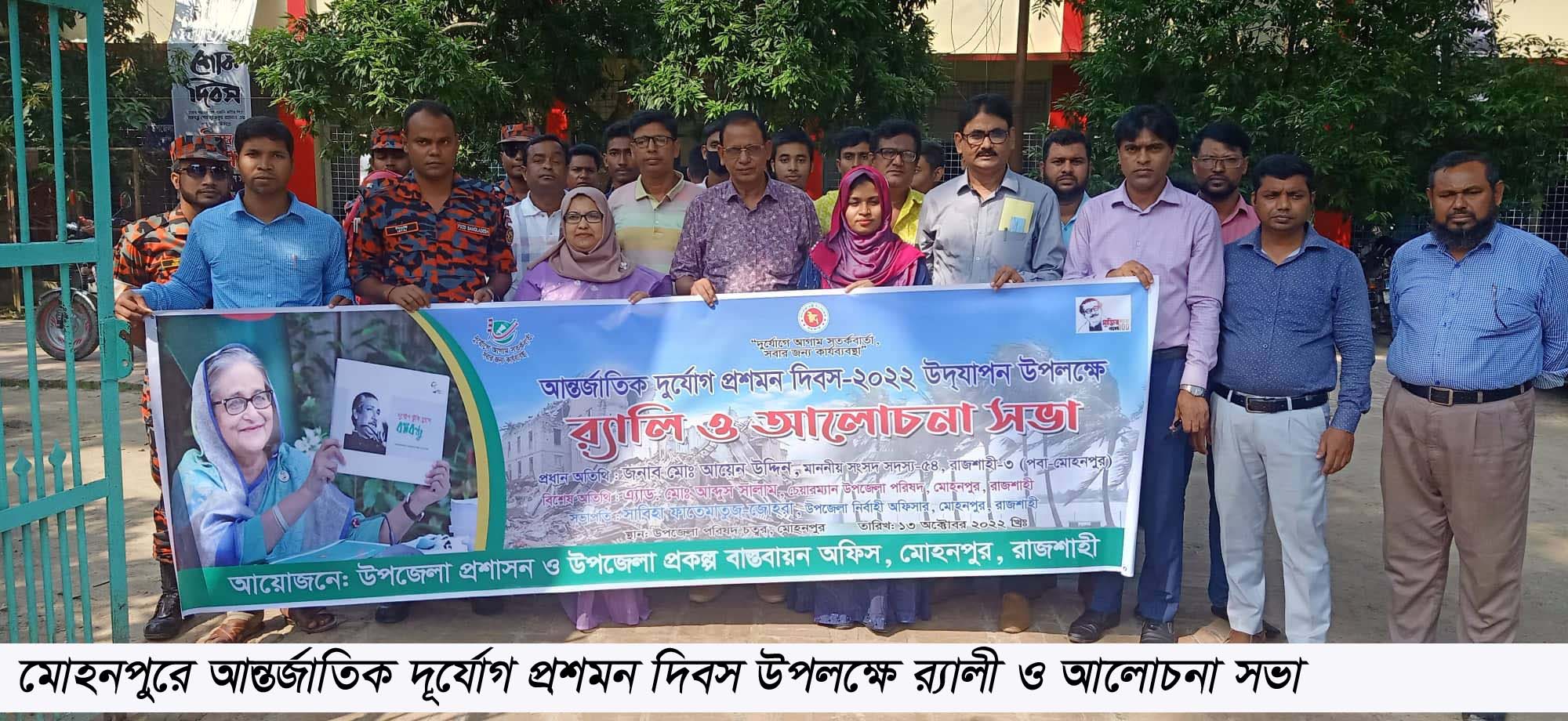 রাজশাহী মোহনপুর উপজেলা প্রশাসন ও প্রকল্পবাস্তবায়ন অফিসের আয়োজনে ‘‘দূর্যোগে আগাম সতর্কবার্তা, সবার জন্য কার্য ব্যবস্থা ’’এই প্রতিপাদ্য কে সামনে রেখে আজ ১৩ ই অক্টোবর বৃহষ্পতিবার দুপুর ১.৩০ মিনিটে মোহনপুর উপজেলা চত্তর থেকে র্যালী, আলোচনা সভা ও অগ্নীনির্বাপণ মহড়া মোহনপুর সরকারি উচ্চবিদ্যালয় মাঠে অনুষ্ঠিত হয়েছে।