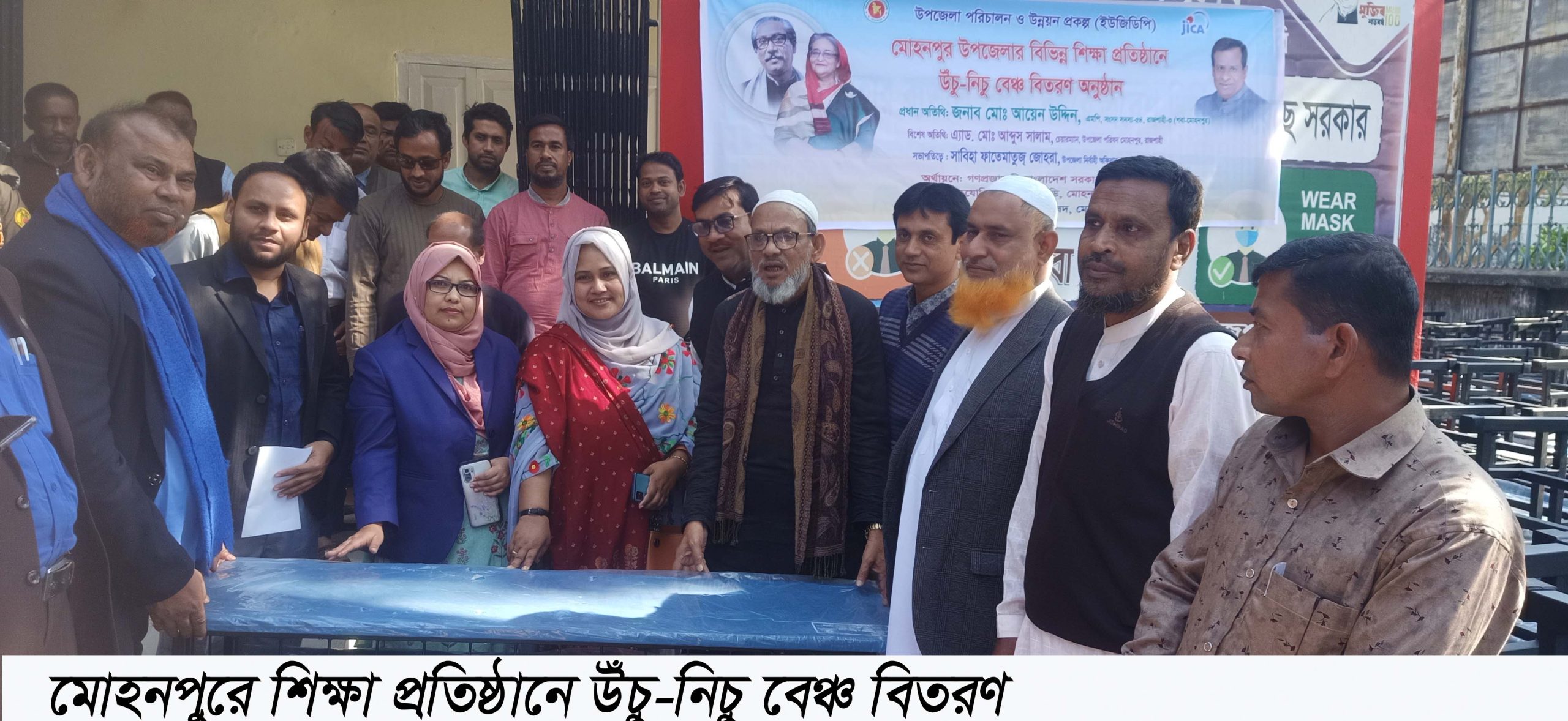 রাজশাহীর মোহনপুর উপজেলা পরিচালন ও উন্নয়ন প্রকল্প (ইউজিডিপি) বাংলাদেশ সরকার ও জাইকার অর্থায়নে, এলজিইডির সহযোগীতায় উপজেলা পরিষদ আজ ১ ডিসেম্বর বৃহষ্পতিবার বেলা ১১ টায় উপজেলা চত্ত¦রে ১৬ টি শিক্ষা প্রতিষ্ঠানে উঁচু-নিচু বেঞ্জ বিতরণ করছে।