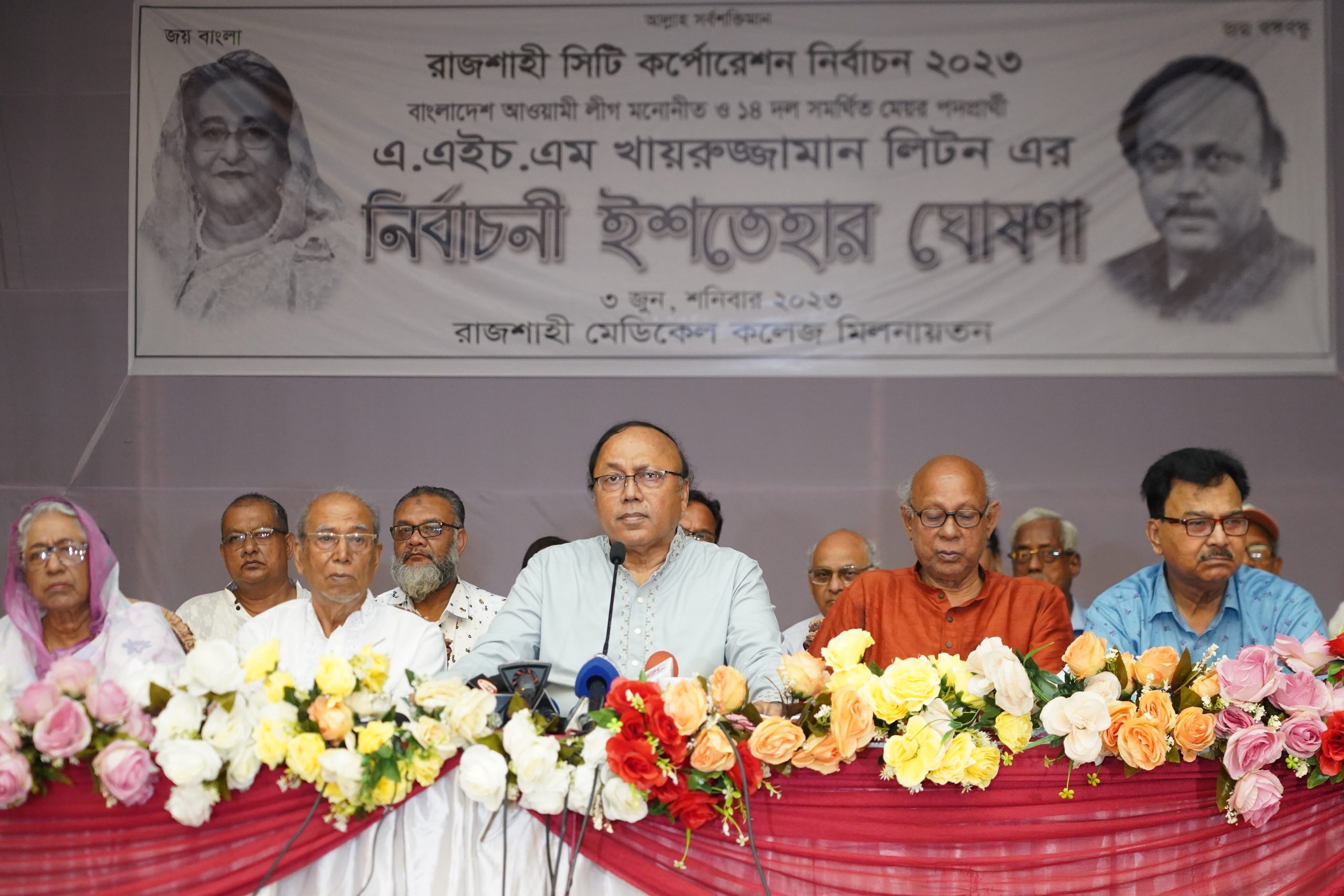 আসন্ন ২১ জুন রাজশাহী সিটি কর্পোরেশন নির্বাচন উপলক্ষ্যে আওয়ামী লীগ মনোনীত ও ১৪ দল সমর্থিত মেয়র প্রার্থী এএইচএম খায়রুজ্জামান লিটন নির্বাচনী ইশতেহার ঘোষণা করেছেন। ‘উন্নয়ন দৃশ্যমান, এবার হবে কর্মসংস্থান’ এই ¯েøাগানকে সামনে রেখে ১০ খাতে ১০৫ দফার উন্নয়ন প্রতিশ্রæতি দিয়ে এই নির্বাচনী ইশতেহার ঘোষণা করেন তিনি। শনিবার (০৩ জুন) রাজশাহী মেডিকেল কলেজ অডিটোরিয়ামে আয়োজিত অনুষ্ঠানে আনুষ্ঠানিকভাবে ইশতেহার ঘোষণা করেন। খায়রুজ্জামান লিটন আওয়ামী লীগের সভাপতিমÐলীর সদস্য ও দুইবারের সাবেক সফল মেয়র।