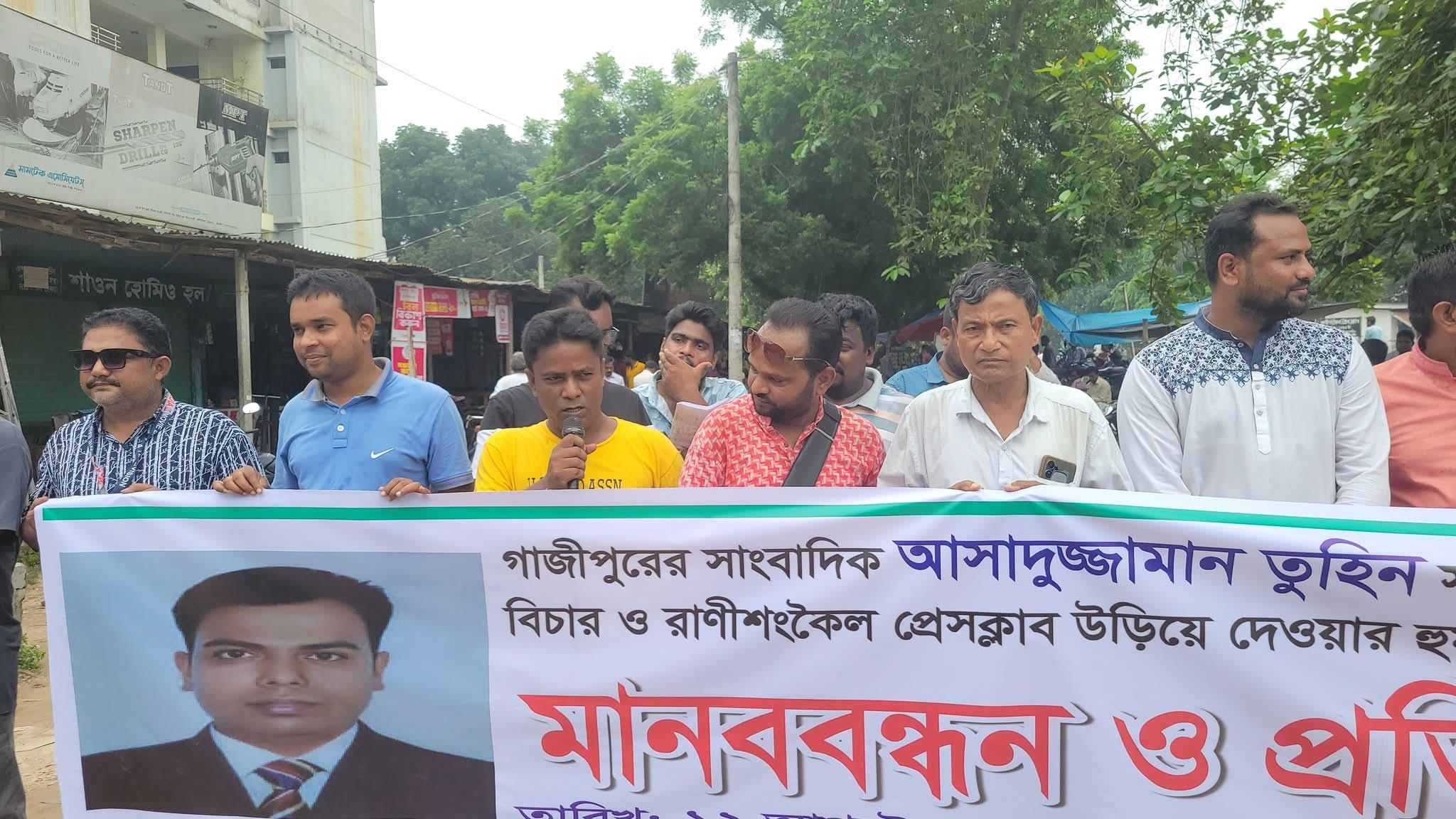 # রানীশংকৈল (ঠাকুর গাঁও) প্রতিনিধিঃ ঠাকুরগাঁ জেলার রানীশংকৈল উপজেলায উপজেলা পরিষদের প্রধান ফটকের সামনে মঙ্গলবার দুপুর ১২ টায় সাংবাদিক আসাদুজ্জামান তুহিন সহ দেশব্যাপী সাংবাদিক হত্যা, নির্যাতনের বিচার ও রাণীশংকৈল প্রেসক্লাবকে উড়িয়ে দেওয়ার হুমকিদাতা মাসুদ রানাকে গ্রেফতারের দাবিতে মানববন্ধন ও প্রতিবাদ সমাবেশ অনুষ্ঠিত হয়েছে।