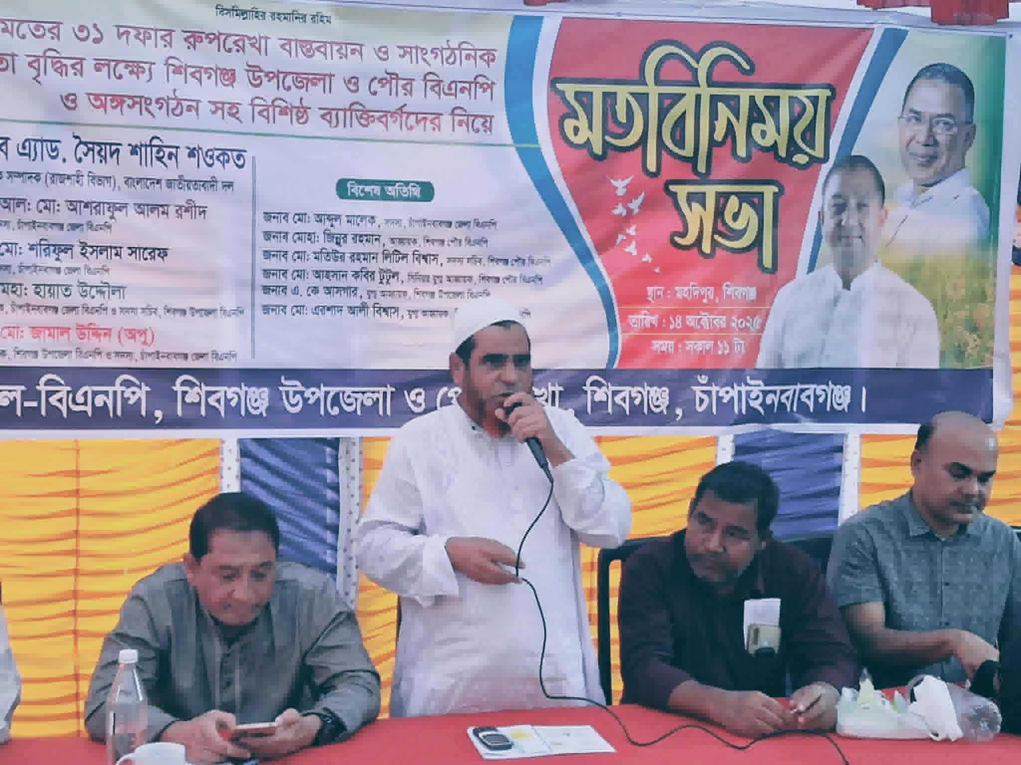 আব্দুল বাতেন: শিবগঞ্জ (চাঁপাইনবাবগঞ্জ), ১৪ সেপ্টেম্বর ২০২৫, মঙ্গলবার: রাষ্ট্র কাঠামো মেরামতের ৩১ দফার রূপরেখা বাস্তবায়ন ও সাংগঠনিক গতিশীলতা বৃদ্ধির লক্ষ্যে বাংলাদেশ জাতীয়তাবাদী দল-বিএনপি’র শিবগঞ্জ উপজেলা ও পৌর শাখার উদ্যোগে এক মতবিনিময় সভা অনুষ্ঠিত হয়।