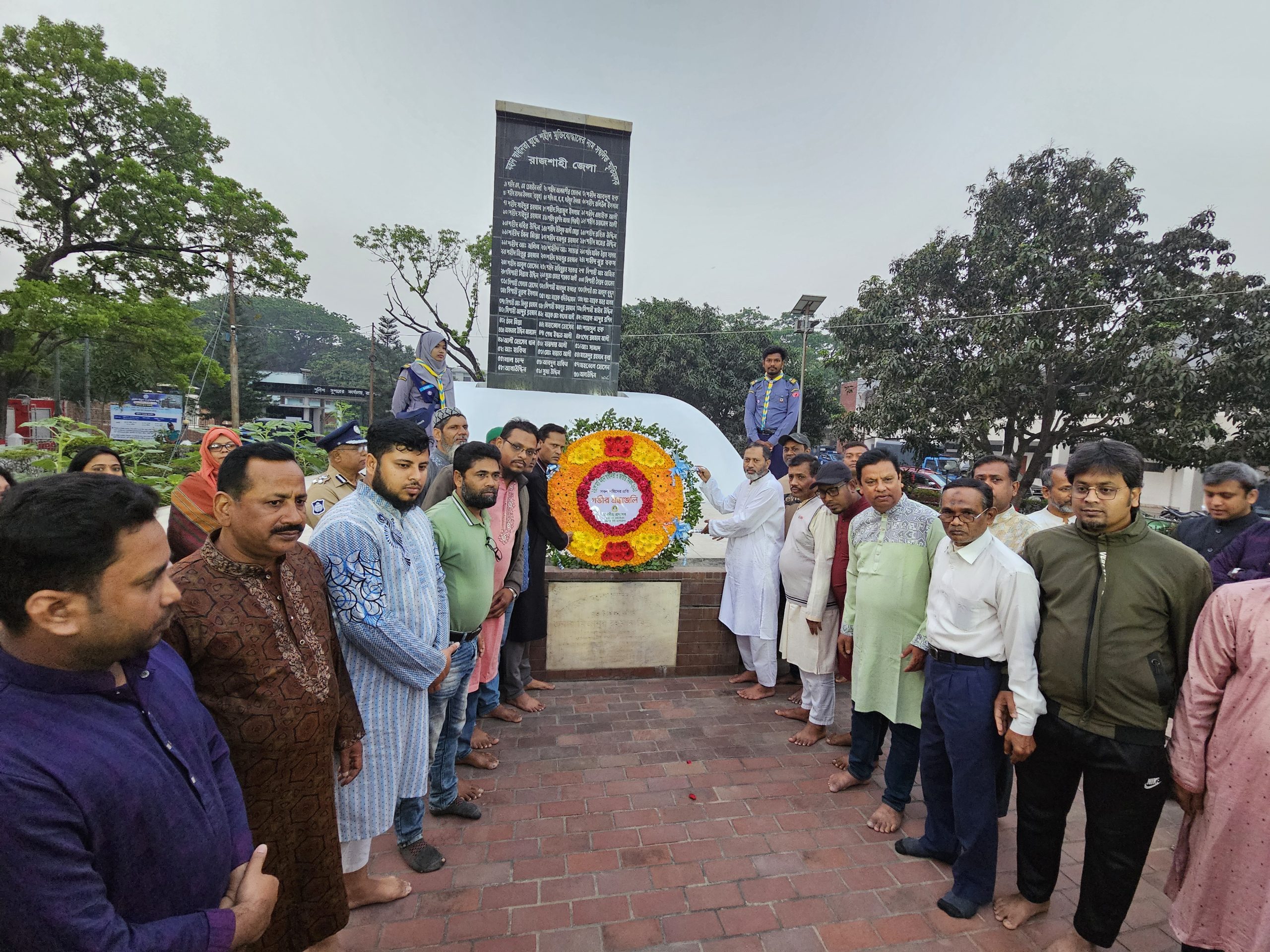 পুস্পস্তবক অর্পণকালে রাসিকের তত্ত্বাবধায়ক প্রকৌশলী আহমেদ আল মঈন পরাগ, বাজেট কাম হিসাব রক্ষণ কর্মকর্তা শফিকুল ইসলাম খান, উপ-প্রধান পরিচ্ছন্ন কর্মকর্তা সেলিম রেজা রঞ্জু, সিটি হাসপাতালের ইনচার্জ ডা. তারিকুল ইসলাম বনি, রাজস্ব কর্মকর্তা সারওয়ার হোসেন, উপসচিব তৈমুর হোসেন, ট্যাক্সেশন কর্মকর্তা (কর) ইমতিয়াজ আহমেদ, জনসংযোগ কর্মকর্তা মোস্তাফিজুর রহমান, উপ-ট্যাক্সেশন কর্মকর্তা মোঃ মহিউদ্দিন, উপ-কর নির্ধারক লুৎফুল হায়দার স্বপন, সহকারী প্রকৌশলী (বিদ্যুৎ) শফিকুল ইসলাম, সহকারী জনসংযোগ কর্মকর্তা (ভারপ্রাপ্ত) মোফাজ্জল হোসেন, সহকারী জনসংযোগ কর্মকর্তা রকিবুল হক তুহিন, পরিচ্ছন্ন কর্মকর্তা (মনিটরিং) শাহরিয়ার রহমান, লাইসেন্স পরিদর্শক সালাহউদ্দিন, লাইসেন্স পরিদর্শক আব্দুল ওহাব তপন, বিভিন্ন ওয়ার্ডের সচিব, স্বাস্থ্য সহকারীসহ বিভিন্ন বিভাগ শাখার কর্মকর্তা-কর্মচারীবৃৃন্দ উপস্থিত ছিলেন।