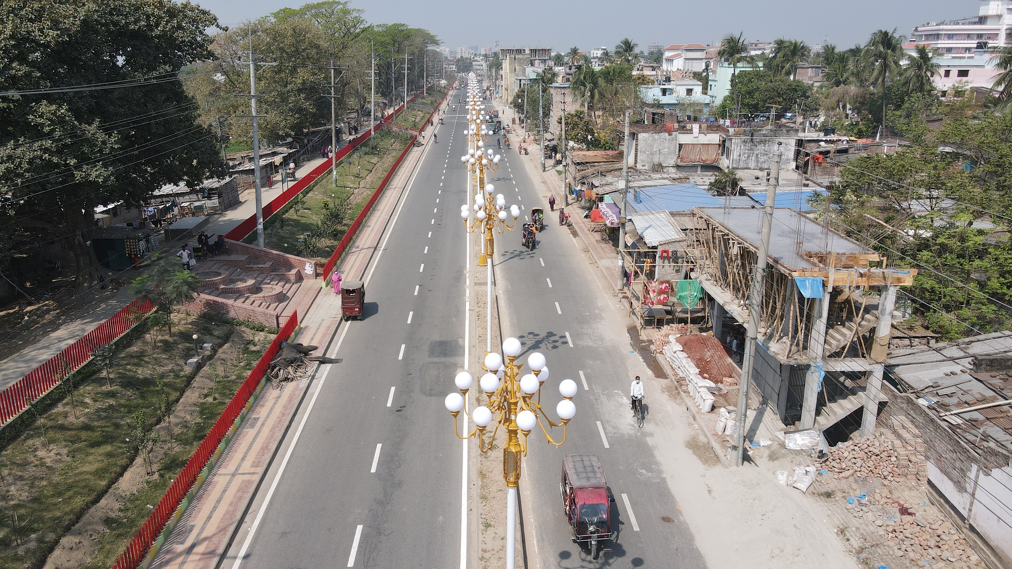 চলছে ভদ্রা মোড় রেলক্রসিং হতে পারিজাত লেক হয়ে নওদাপাড়া বাস টার্মিনাল পর্যন্ত অযান্ত্রিক যানবাহন লেনসহ চারলেন সড়কের নির্মাণ। ৪ দশমিক ১৭ কিলোমিটার সড়কের নির্মাণে ব্যয় ধরা হয়েছে ৬৯ কোটি ৭৮ লাখ টাকা। সড়কটি প্রশস্ত হবে ৮০ ফুট। ফোরলেনের সড়ক ছাড়াও দুই লেনের অযান্ত্রিক যানবাহন লেন, সড়ক বিভাজক ও দুইপাশে ড্রেন ও ফুটপাত নির্মাণ করা হবে। সড়কগুলোর আইল্যান্ডে সৌন্দর্য্য বৃদ্ধিতে বৃক্ষরোপণের মাধ্যমে সবুজায়ন করা হবে। সড়কটি নির্মাণে অত্র এলাকার আর্থসামাজিক অবস্থার আমূল পরিবর্তন ঘটবে।
