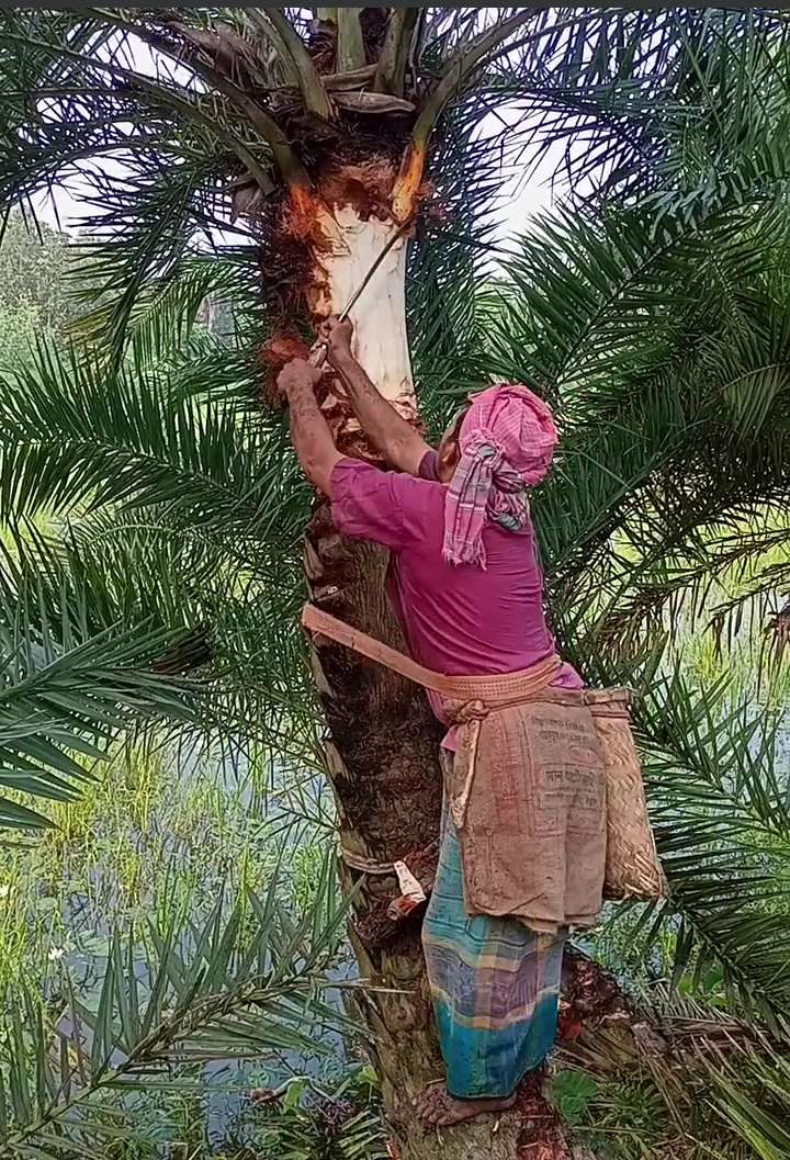 শীতের সুমিস্টি পানিও পানি খেজুররস আহরনের জন্য গাজিরাও ব্যাস্ত গাছ প্রস্তুতিতে। মাজায় রসি পেচিয়ে খেজুর গাছের সাথে নিজে শক্ত করে বেধে ধারাল হাঁসুয়া দিয়ে রসের জন্য গাছকে প্রস্তুত করতে ব্যাস্ত গাছিরা।