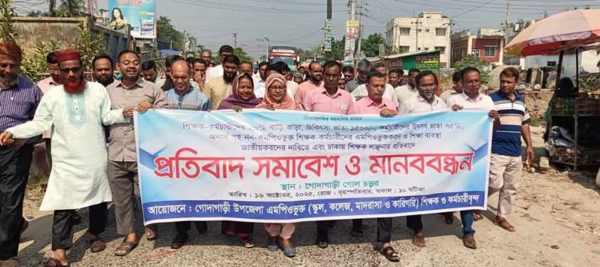 # গোদাগাড়ী (রাজশাহী)প্রতিনিধিঃ বেতন–ভাতা বৃদ্ধি, এমপিওভুক্তকরণ ও শিক্ষা ব্যবস্থার জাতীয়করণের দাবি ও ঢাকায় পুলিশ কতৃক শিক্ষক নির্যাতনের প্রতিবাদে রাজশাহীর গোদাগাড়ীতে মানববন্ধন ও প্রতিবাদ সমাবেশ করেছে শিক্ষক–কর্মচারীরা। বৃহস্পতিবার (১৬ অক্টোবর) সকালে গোদাগাড়ীতে এমপিও ভুক্ত স্কুল, কলেজ, মাদ্রাসা ও কারিগরি শিক্ষাপ্রতিষ্ঠানের শিক্ষক ও কর্মচারীরা গোদাগাড়ী সদরে গোলচত্বরে এ কর্মসূচি পালন করেন।