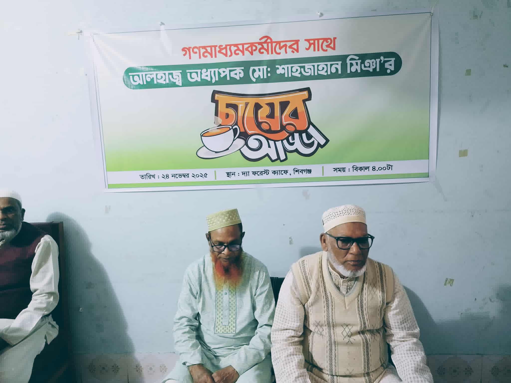 আব্দুল বাতেন, শিবগঞ্জ: চাঁপাইনবাবগঞ্জের শিবগঞ্জে জেলার বিভিন্ন গণমাধ্যমে কর্মরত সাংবাদিকদের সঙ্গে সৌহার্দ্যপূর্ণ চায়ের আড্ডায় মিলিত হয়েছেন আলহাজ্ব অধ্যাপক মো. শাহজাহান মিঞা। সোমবার (২৪ নভেম্বর ২০২৫) বিকাল ৪টায় শিবগঞ্জের দ্যা ফরেস্ট ক্যাফে-তে অনুষ্ঠিত এই অনানুষ্ঠানিক আড্ডায় স্থানীয় রাজনৈতিক প্রেক্ষাপট, দলীয় কার্যক্রম, গণমাধ্যমের ভূমিকা এবং এলাকার সার্বিক পরিস্থিতি নিয়ে মতবিনিময় হয়।