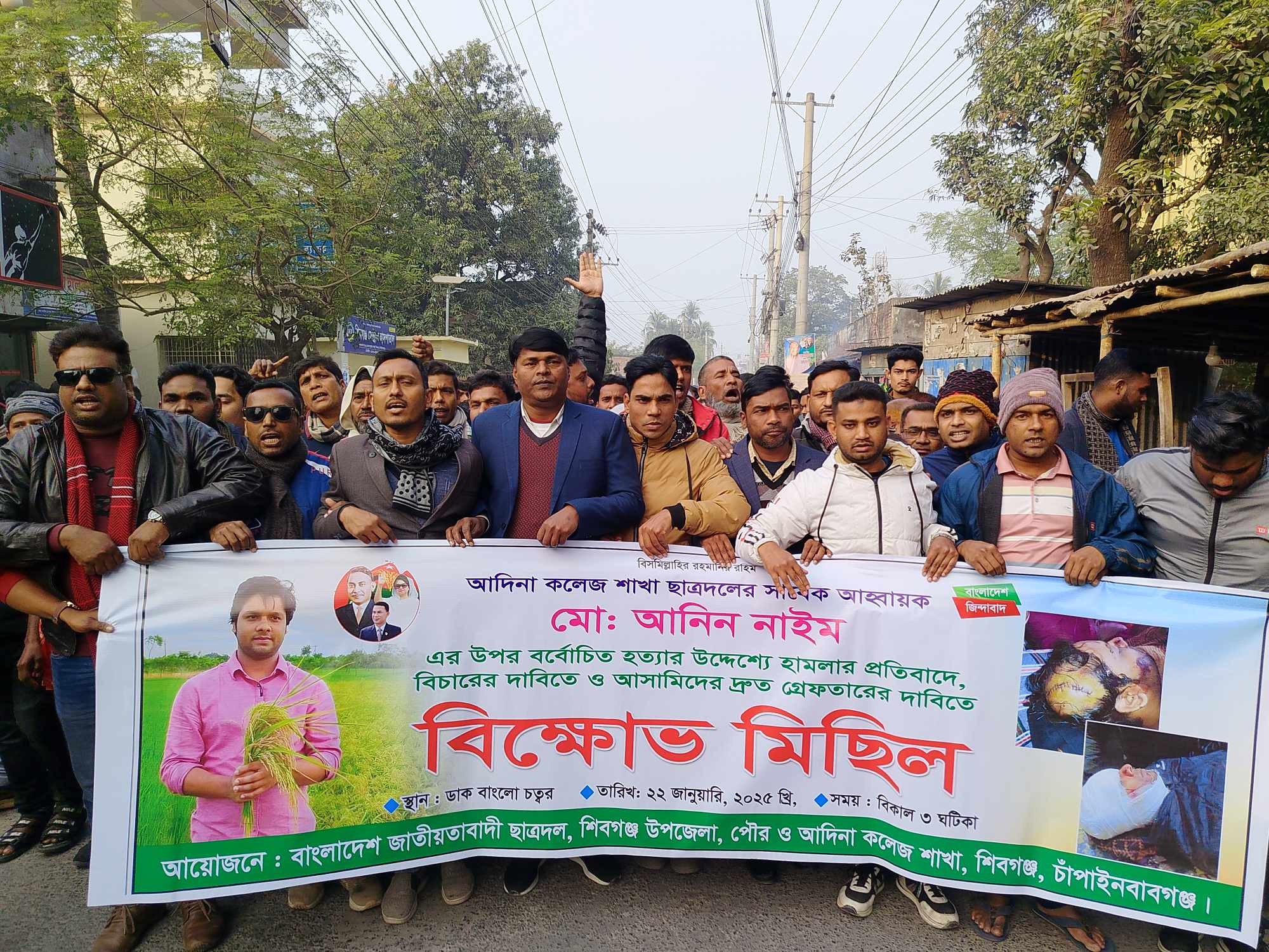 আব্দুল তাতেন, শিবগঞ্জে থেকে: চাঁপাইনবাবগঞ্জের শিবগঞ্জে আবারো ছাত্রদলের সাবেক নেতা আনিন নাইম (৩২) কে কুপিয়ে হত্যা চেষ্টার অভিযোগ উঠলেও এ ঘটনায় গত ৮ দিনেও পুলিশ কোন আসামীকে গ্রেপ্তার করতে পারেনি। প্রতিবাদে বুধবার বিকেলে বিক্ষোভ মিছিল করে ছাত্রদল।আহত ব্যক্তি আদিনা ফজলুল হক সরকারি কলেজ শাখা ছাত্রদলের সাবেক আহবায়ক ও দাদনচক এলাকার আরিফ উদ্দিনের ছেলে আনিন নাইম ।