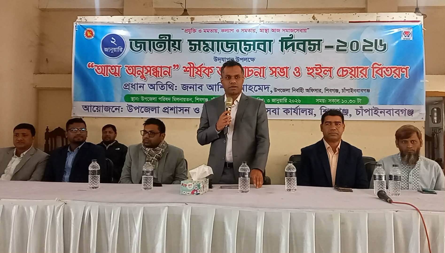 # শিবগঞ্জ (চাঁপাইনবাবগঞ্জ) প্রতিনিধি: "প্রযুক্তি ও মমতায়, কল্যাণ ও সমতায়, আস্থা আজ সমাজসেবায়" এই প্রতিপাদ্যে- চাঁপাইনবাবগঞ্জের শিবগঞ্জে জাতীয় সমাজসেবা দিবস পালিত হয়েছে। দিবসটি উপলক্ষে শনিবার সকালে শিবগঞ্জ উপজেলা প্রশাসন ও উপজেলা সমাজসেবা কার্যালয়ের উদ্যোগে উপজেলা পরিষদ মিলনায়তনে আত্ম অনুসন্ধান শীর্ষক আলোচনা সভা ও হুইল চেয়ার বিতরণের আয়োজন করা হয়।