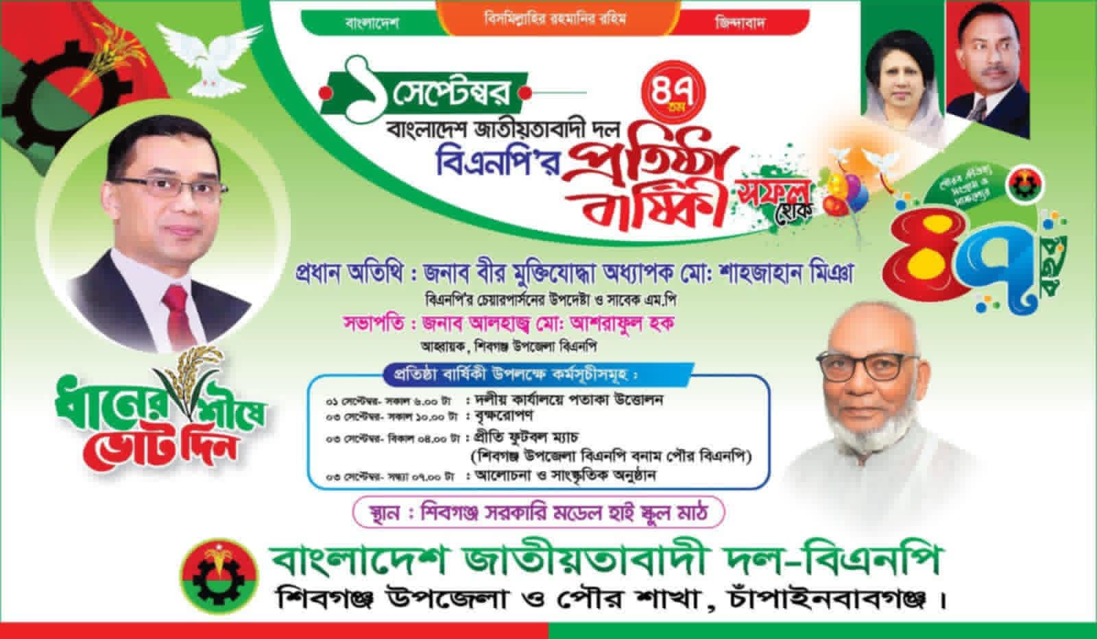 # শিবগঞ্জ প্রতিনিধি: বিএনপি’র ৪৭তম প্রতিষ্ঠাবার্ষিকী উপলক্ষে শিবগঞ্জ উপজেলা ও পৌর বিএনপির উদ্যোগে দুইদিনব্যাপী কর্মসূচির আয়োজন করা হয়েছে।