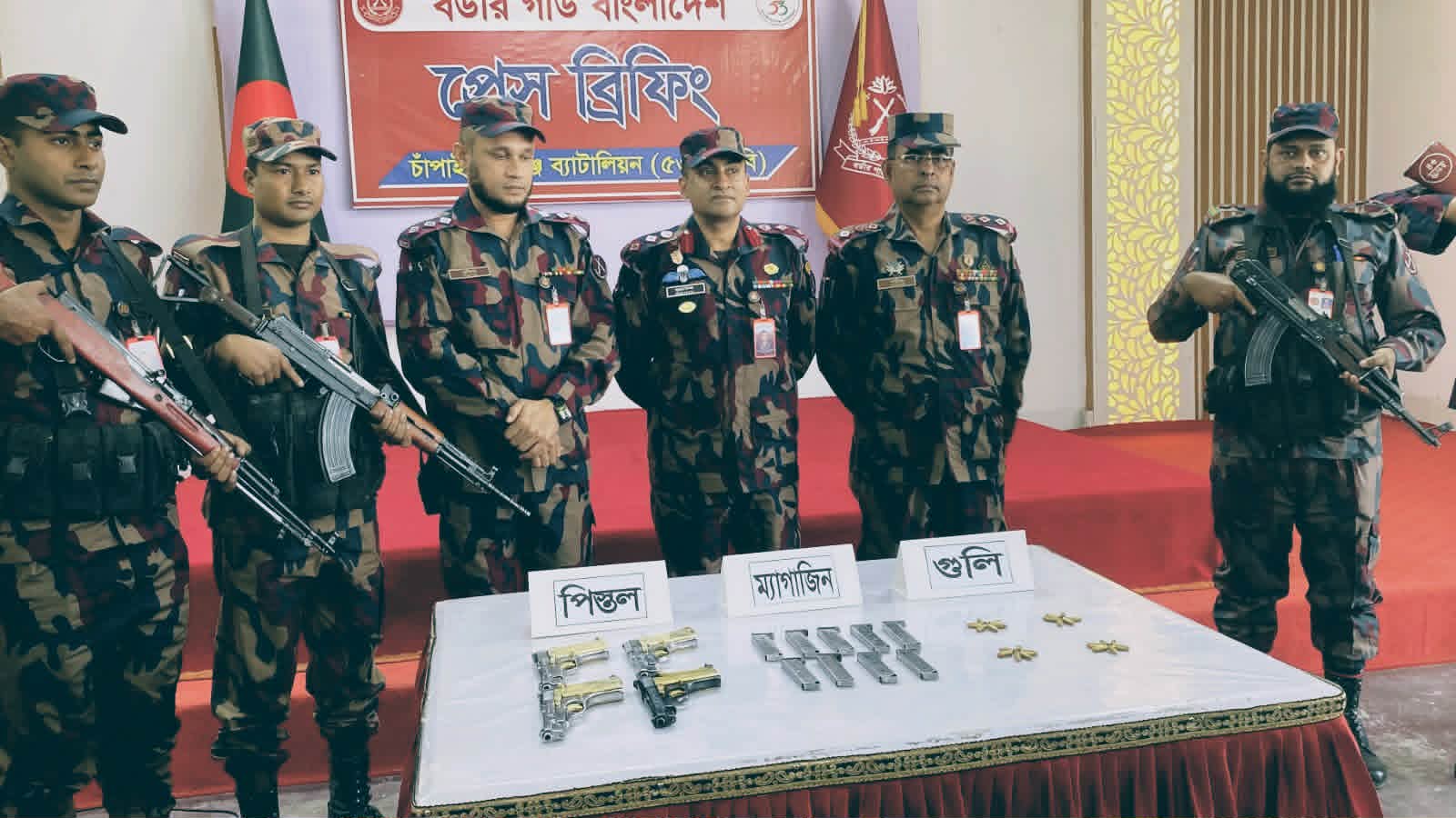 গোয়েন্দা সূত্রে জানা যায়, চাঁপাইনবাবগঞ্জ সীমান্ত দিয়ে দুষ্কৃতিকারীরা বাংলাদেশের অভ্যন্তরে বিশৃঙ্খলা সৃষ্টির উদ্দেশ্যে অবৈধ অস্ত্র প্রবেশের পরিকল্পনা করছে। এরই ধারাবাহিকতায় ঊর্ধ্বতন কর্তৃপক্ষের নির্দেশনায় মনোহরপুর বিওপি’র দায়িত্বপূর্ণ এলাকায় সীমান্ত থেকে আনুমানিক এক কিলোমিটার বাংলাদেশের অভ্যন্তরে গোপালপুর এলাকায় একটি বিশেষ অভিযান পরিচালনা করা হয়। অভিযানকালে দুইজন মোটরসাইকেল আরোহীকে থামার সংকেত দিলে তারা দ্রুত দিক পরিবর্তন করে পালিয়ে যাওয়ার চেষ্টা করে। এ সময় একটি ব্যাগ মোটরসাইকেল থেকে পড়ে গেলে টহল দল তা উদ্ধার করে তল্লাশি চালায়। তল্লাশিতে ব্যাগের ভেতর কালো পলিথিনে মোড়ানো যুক্তরাষ্ট্রে প্রস্তুতকৃত চারটি বিদেশি পিস্তল, নয়টি ম্যাগাজিন এবং ২৪ রাউন্ড গুলি উদ্ধার করা হয়।