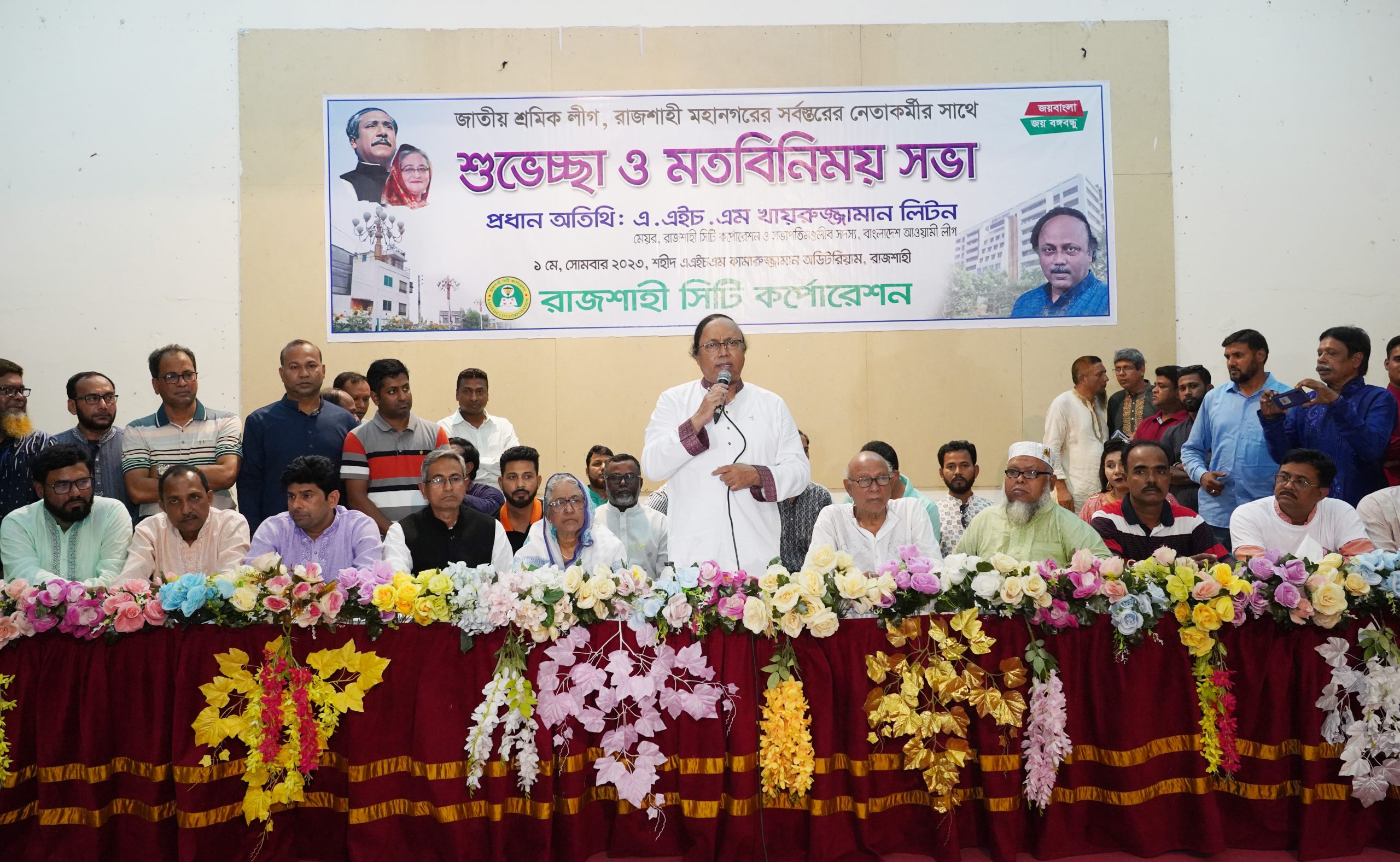বাংলাদেশ আওয়ামী লীগের সভাপতিমণ্ডলীর সদস্য ও রাজশাহী সিটি কর্পোরেশনের মাননীয় মেয়র এএইচএম খায়রুজ্জামান লিটন বলেছেন, মাননীয় প্রধানমন্ত্রী শেখ হাসিনার নেতৃত্বাধীন বর্তমান সরকার দেশের উন্নয়ন এবং শ্রমিক সহ দেশের সকল মানুষের কল্যানে নিরলসভাবে কাজ করে যাচ্ছেন। মাননীয় প্রধানমন্ত্রী শেখ হাসিনার নেতৃত্বে বাংলাদেশ দুর্বার গতিতে এগিয়ে যাচ্ছে। মহাকাশে বঙ্গবন্ধু স্যাটেলাইট-১ ঘুরছে। এবার বঙ্গবন্ধু স্যাটেলাইট-২ প্রস্তুত হচ্ছে। পদ্মা সেতু নির্মিত হয়েছে, টানেল নির্মাণ হচ্ছে, চারলেন, ছয় লেন, আট লেনের সড়ক নির্মাণ হচ্ছে। দেশের গৃহহীনদের গৃহ নির্মাণ করে দিচ্ছেন প্রধানমন্ত্রী শেখ হাসিনা। গৃহহীন প্রত্যেকটি মানুষের মাথার উপর ছাদ থাকবে, সেই চিন্তা বিশ্বে একজনই করেছেন, তিনিই প্রধানমন্ত্রী শেখ হাসিনা।